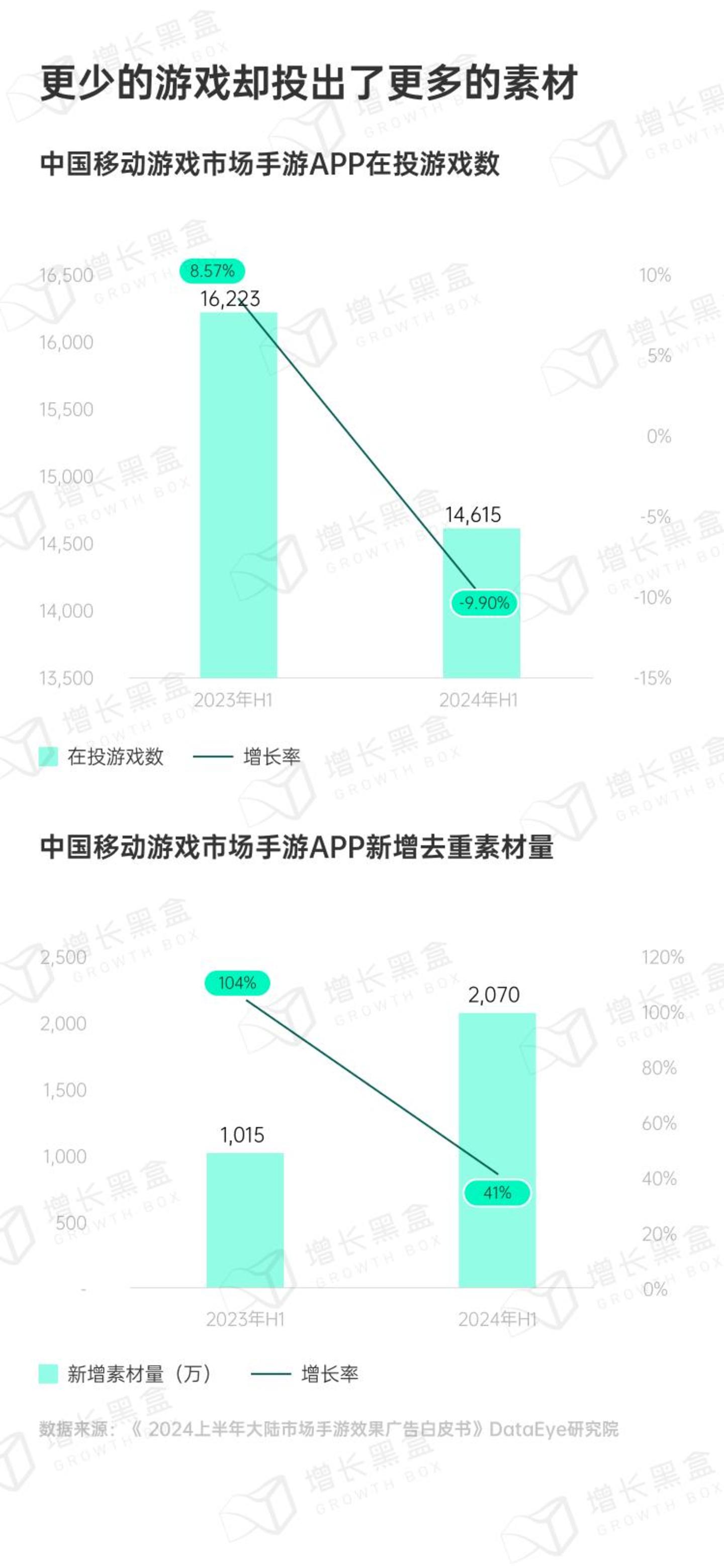 从手游在投总数来看,2024上半年其实下滑了10%,头部效应更集中了。然而,整体素材数量却增长了41% - 整个行业“堆基建”的现象愈发严重。