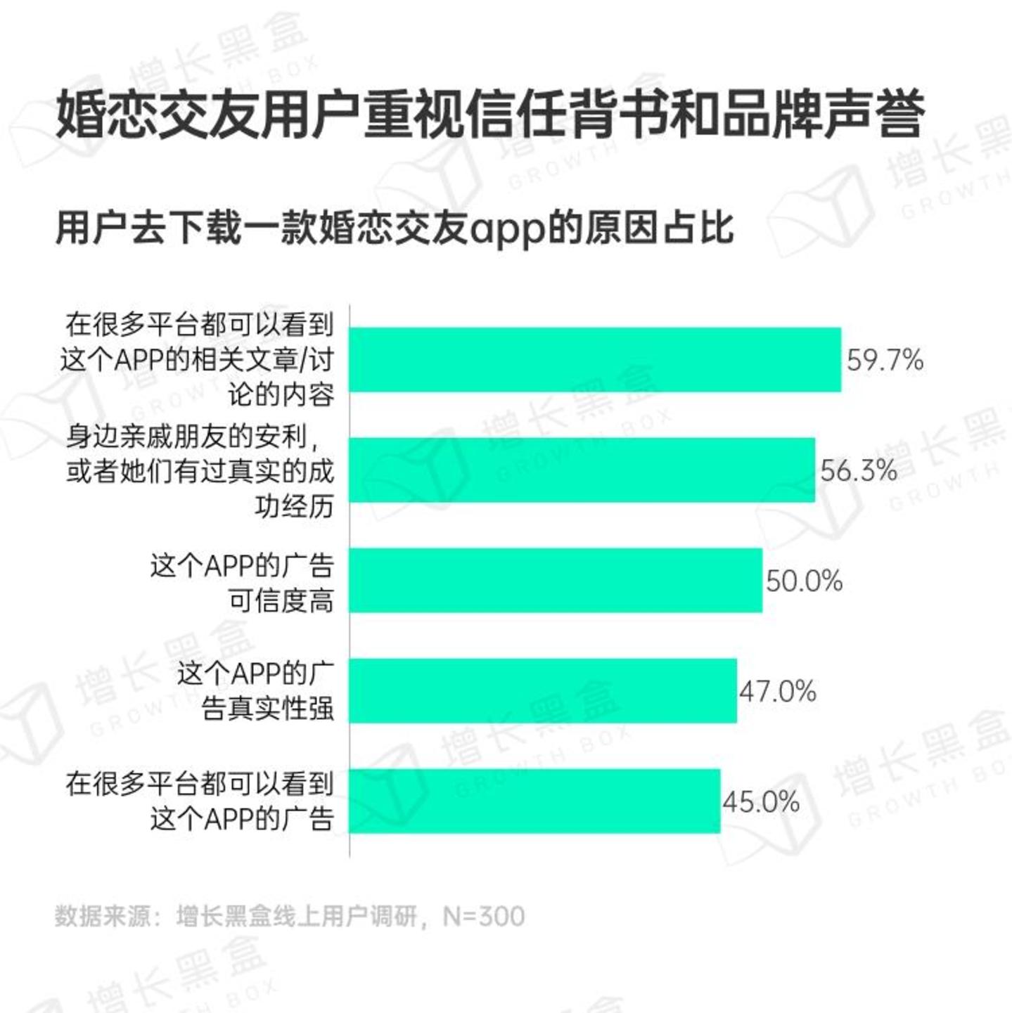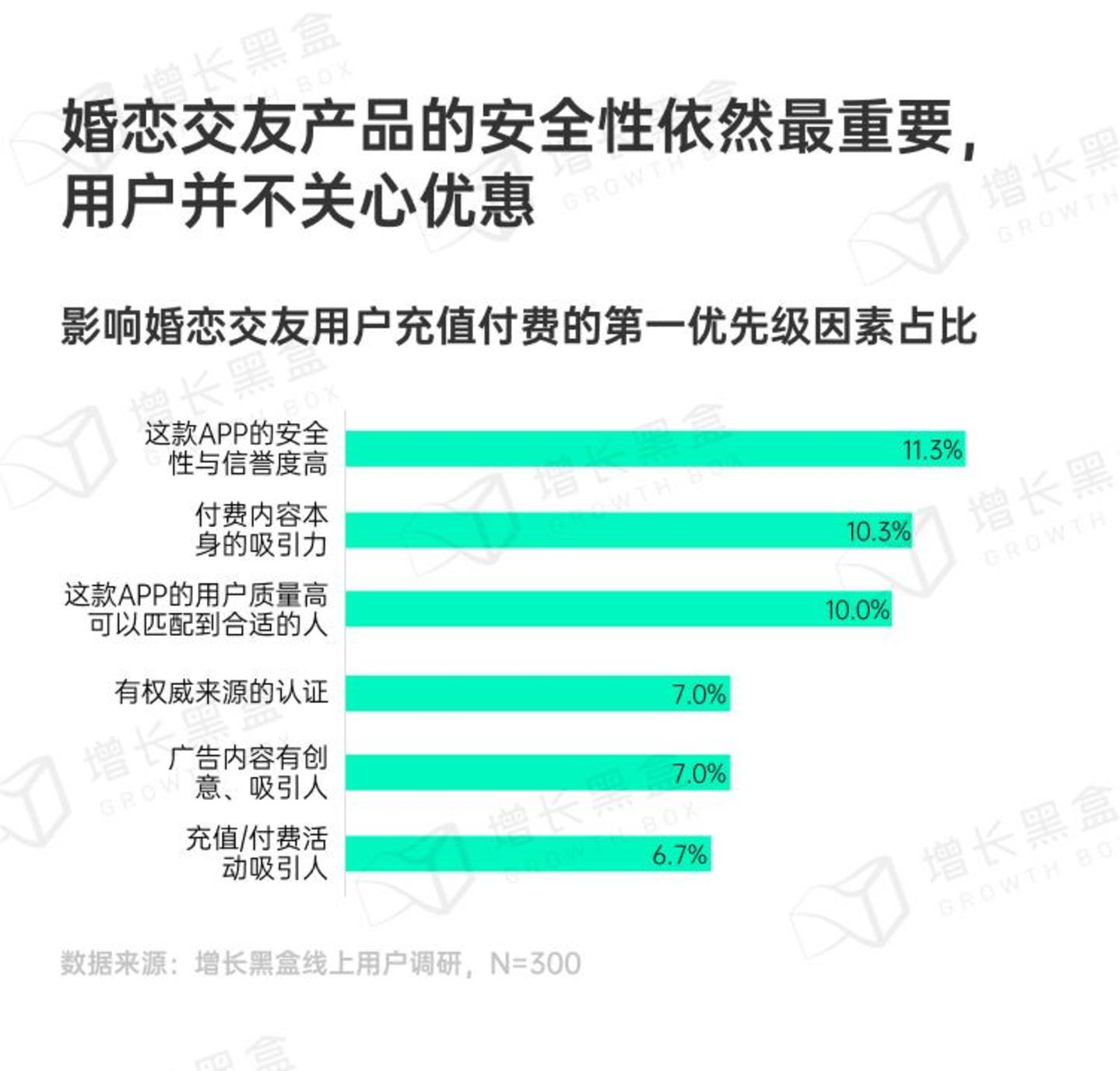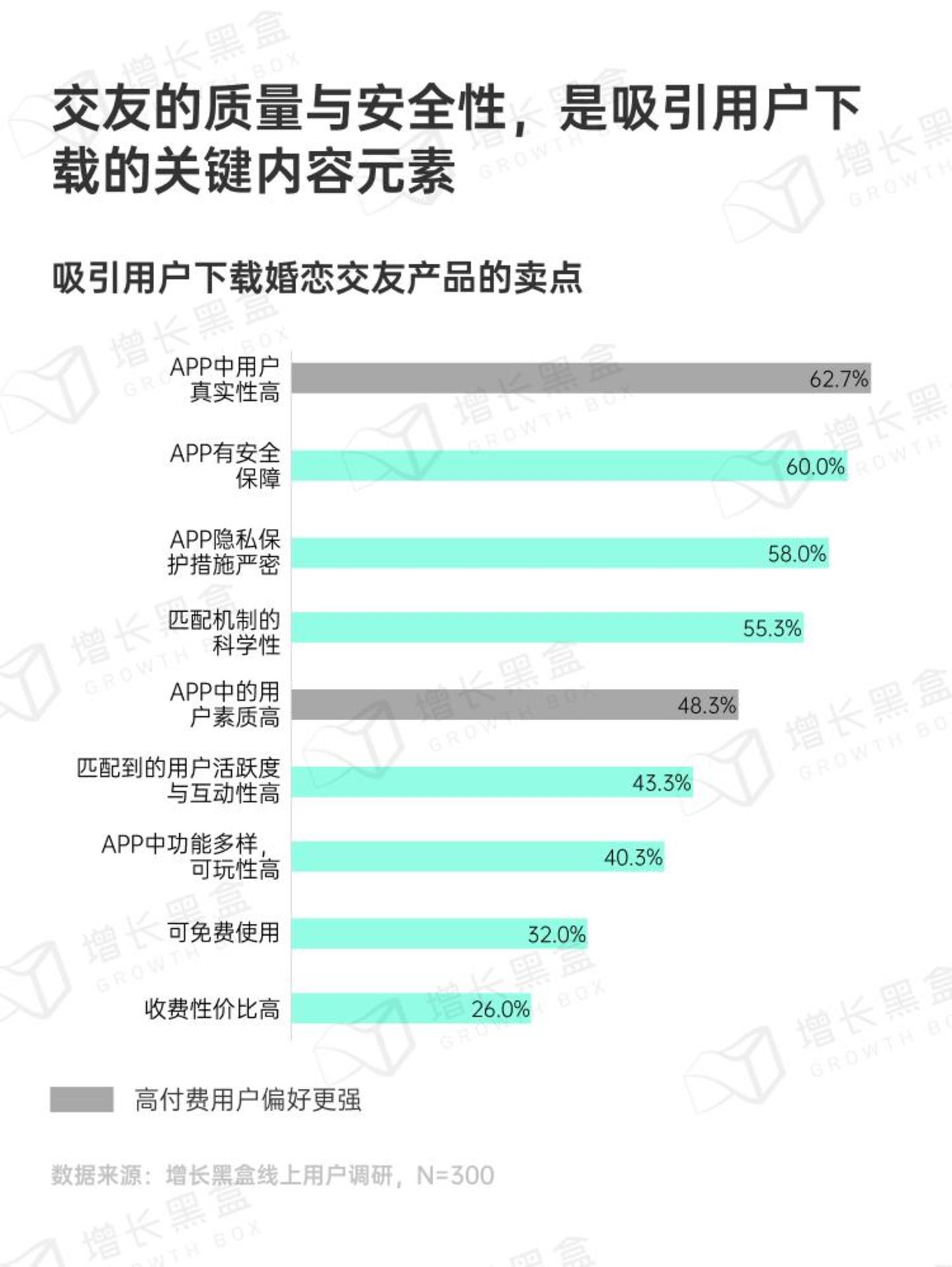 调研结果表明,用户选择婚恋交友产品时最看重的是产品的可信度和安全性,其次是付费项目本身。而精准的匹配算法也对用户决策有较大影响。对于婚恋交友产品来说: