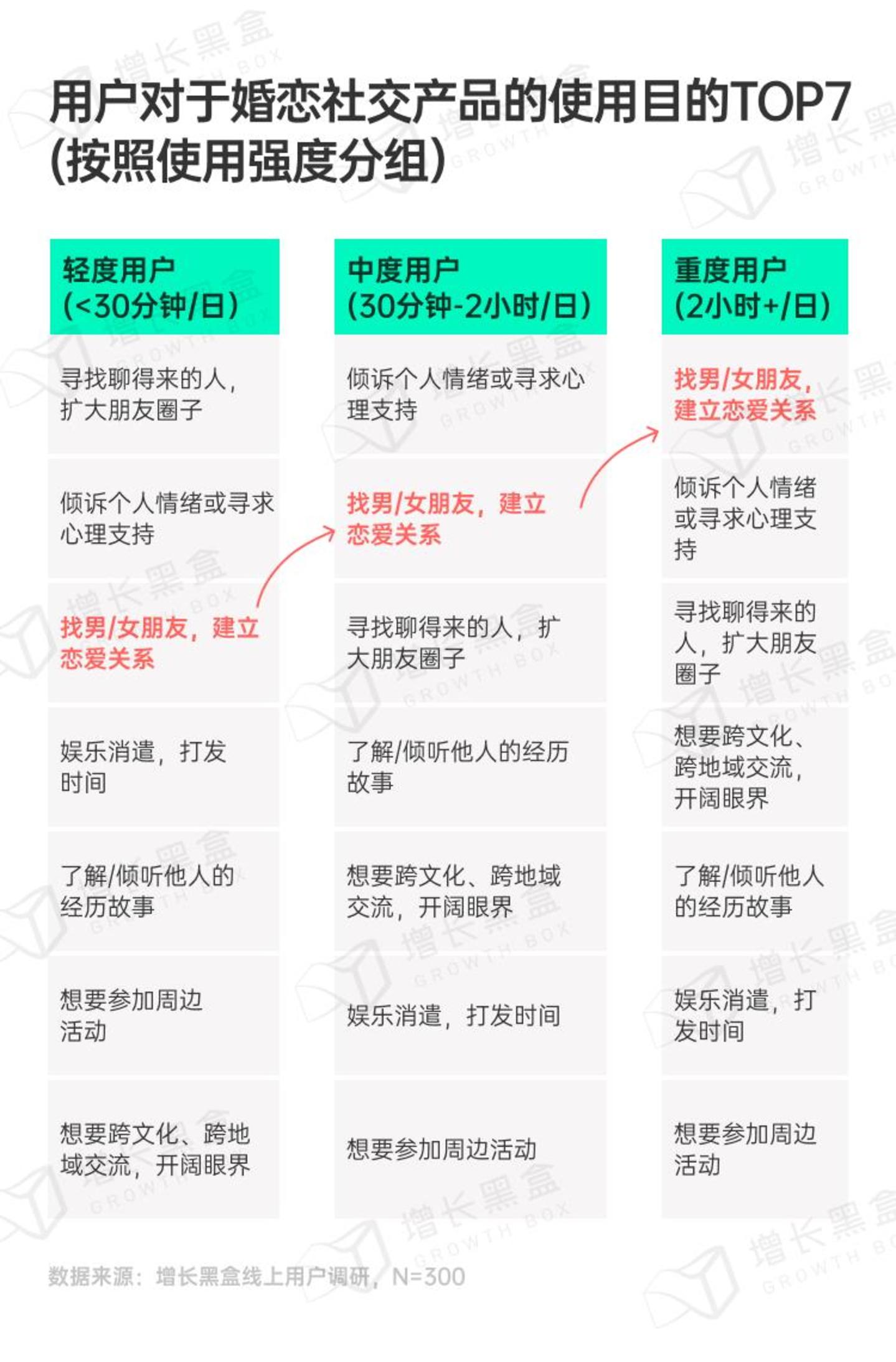 与游戏产品的娱乐属性不同,婚恋交友用户很多时候都在严肃的考虑寻找“人生的另一半”:使用时长越高,该目的优先级排名也就越高。