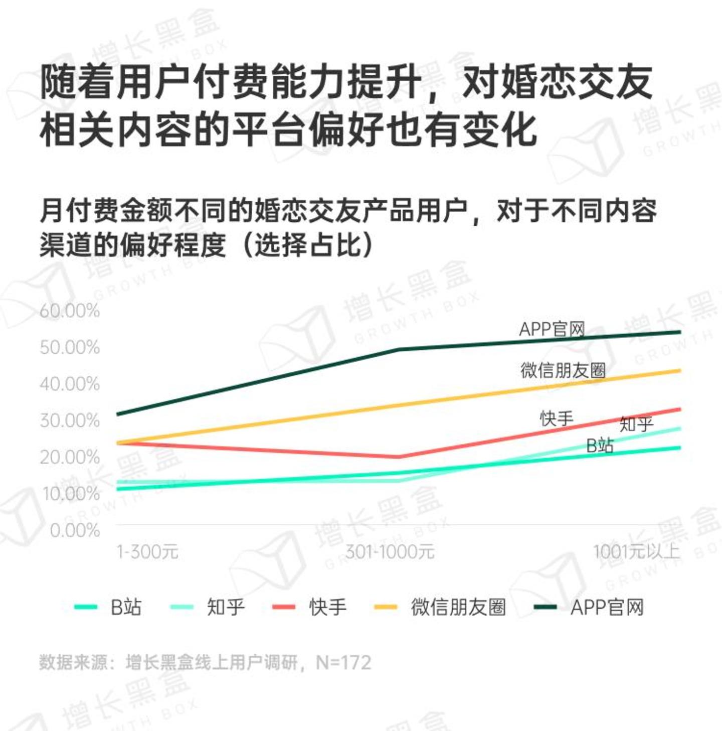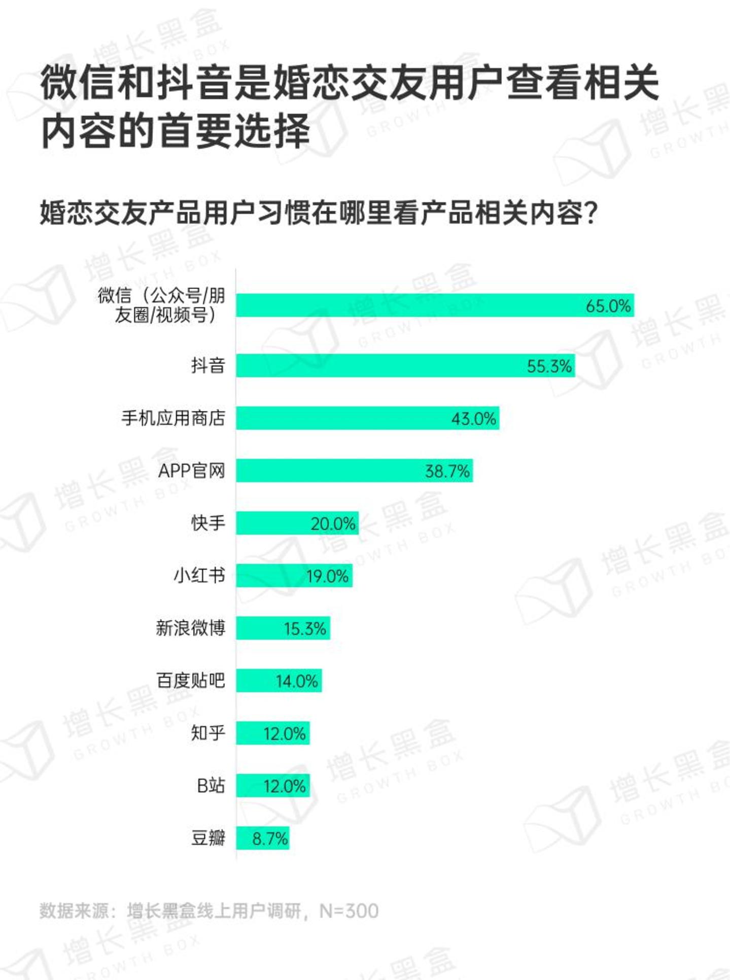 与游戏产品相似,当用户对于婚恋交友产品有精准兴趣时,还是更常去微信和抖音看相关内容。同时,由于社交属性的存在,微信成为了最主要的渠道。