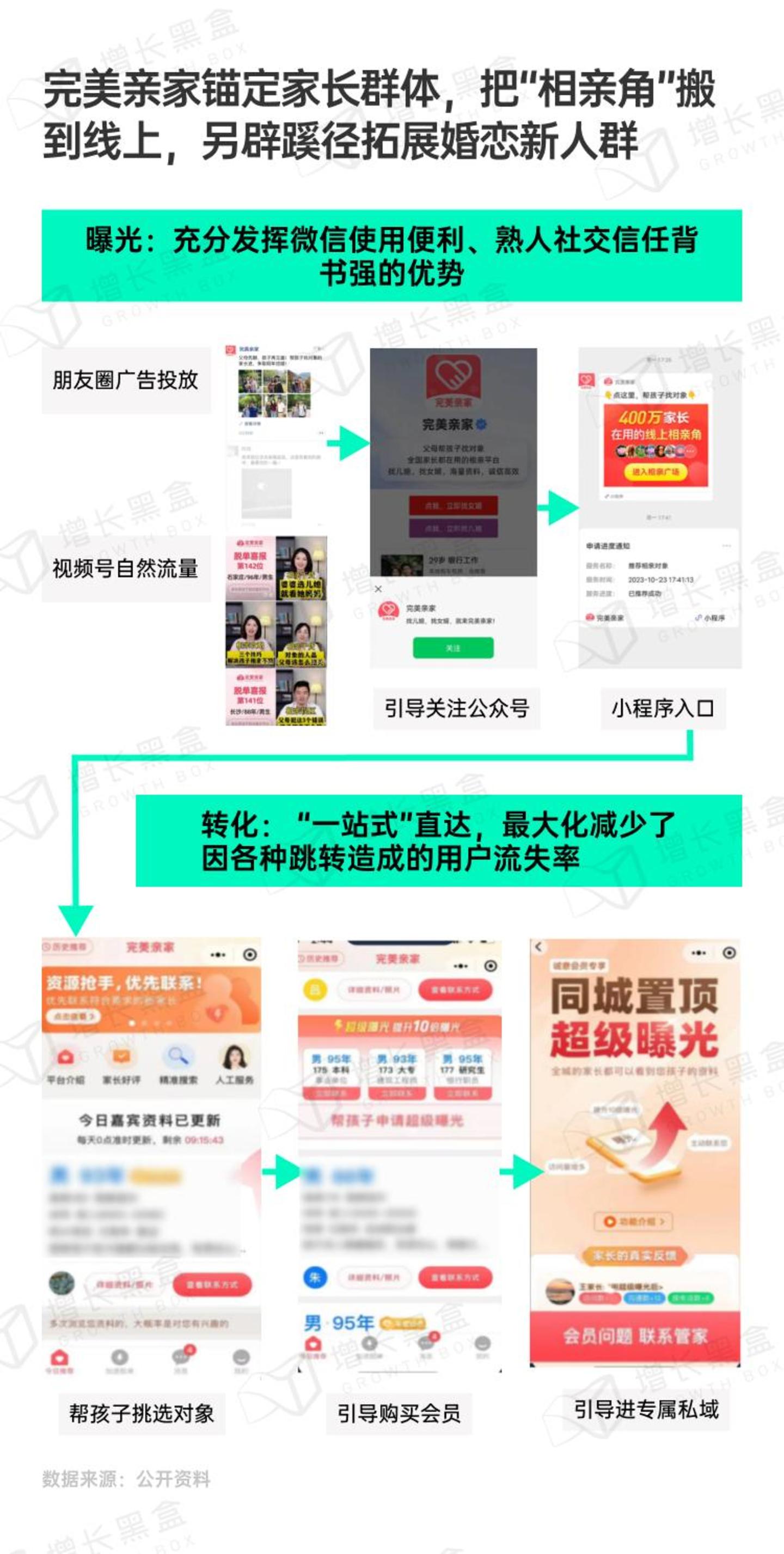 带着独特的市场定位,《完美亲家》在腾讯生态下,也找到了一条全链路提效的捷径。考虑父母辈普遍的手机使用习惯,产品将最为广泛使用的“微信朋友圈 / 视频号”作为核心的营销入口,引导用户关注公众号后、进入小程序,再完成“体验、交付、进入私域流量”的全流程。基于微信生态,也更适宜长辈在亲友间的便捷交流与分享,自然实现用户破圈。