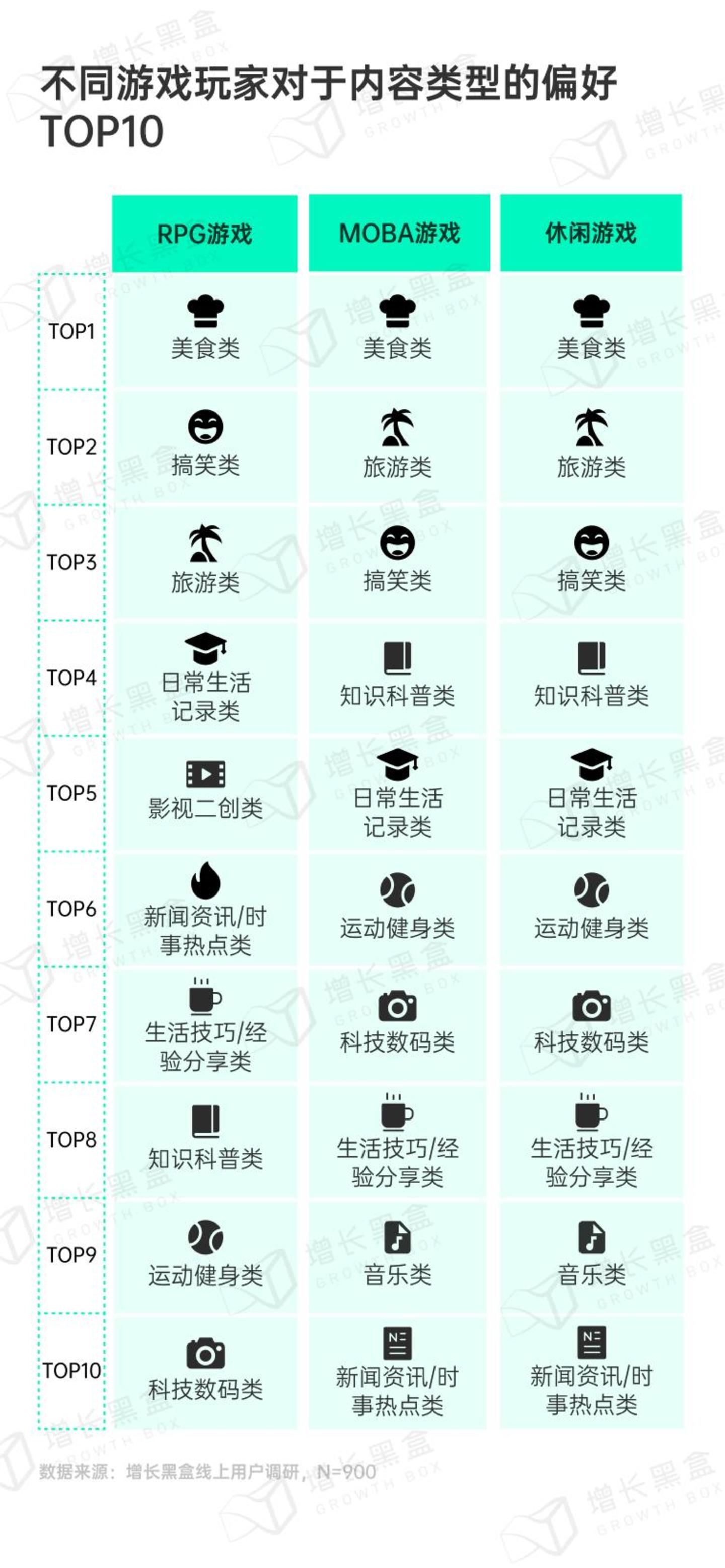 我们就以短视频内容为例来看:美食、旅游、搞笑类是各种游戏玩家前三的兴趣点,而RPG玩家更偏好影视二创类和新闻资讯类,MOBA、休闲玩家更偏好知识科普类和运动健身类。