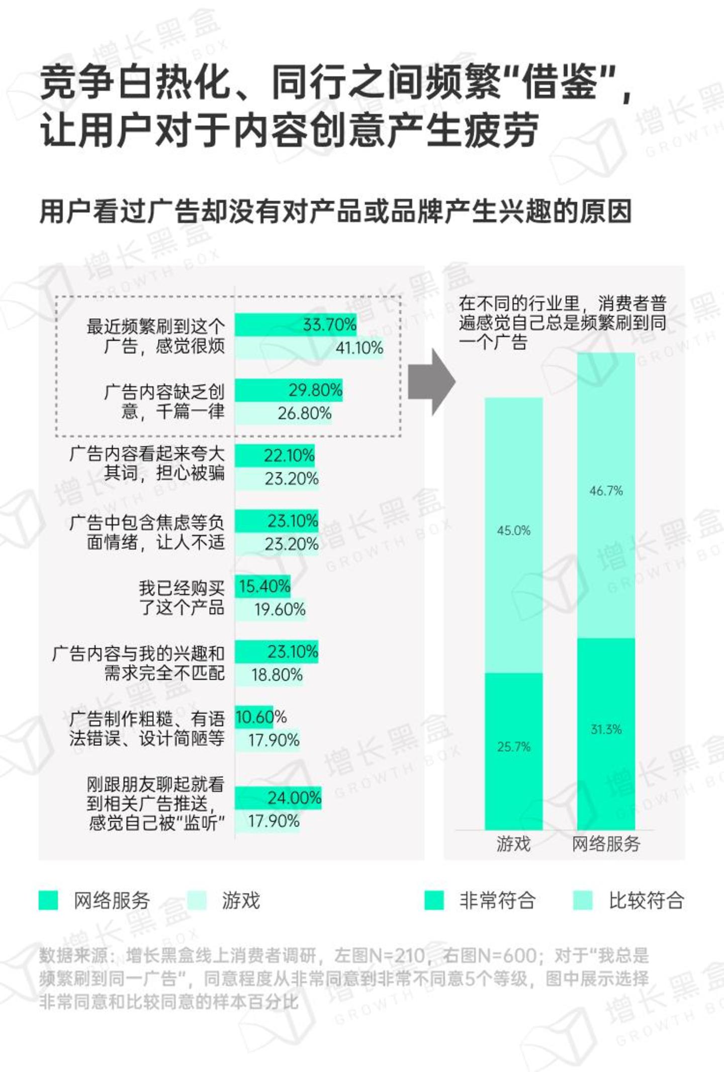 我们的调研显示:用户看到广告却没有点击,主要是因为“频繁刷到同一个广告,感觉很烦”,以及“广告缺乏创意,千篇一律”。在游戏和网络服务行业,分别有70.7%和78%的用户明确表示自己总是刷到“同一个”广告。