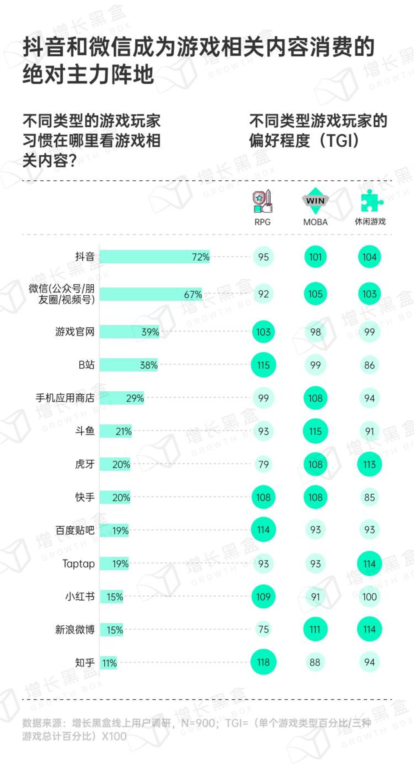 从三大类游戏总体特征来看,当玩家们对于游戏有了精准的需求时,更偏好在抖音和微信浏览游戏相关内容,比如当他们想要查看攻略、发现新游戏、参与游戏新活动等。