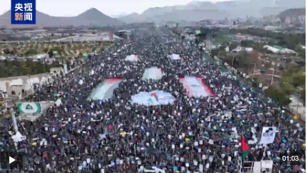 总台报道员 哈桑·巴姆什穆斯:与许多国家举行的集会一样,在也门首都萨那南部的七十广场, 当地民众也举行了大规模游行活动。当前,随着美以持续对伊朗发动军事打击,外界对战争外溢的担忧正在加剧。