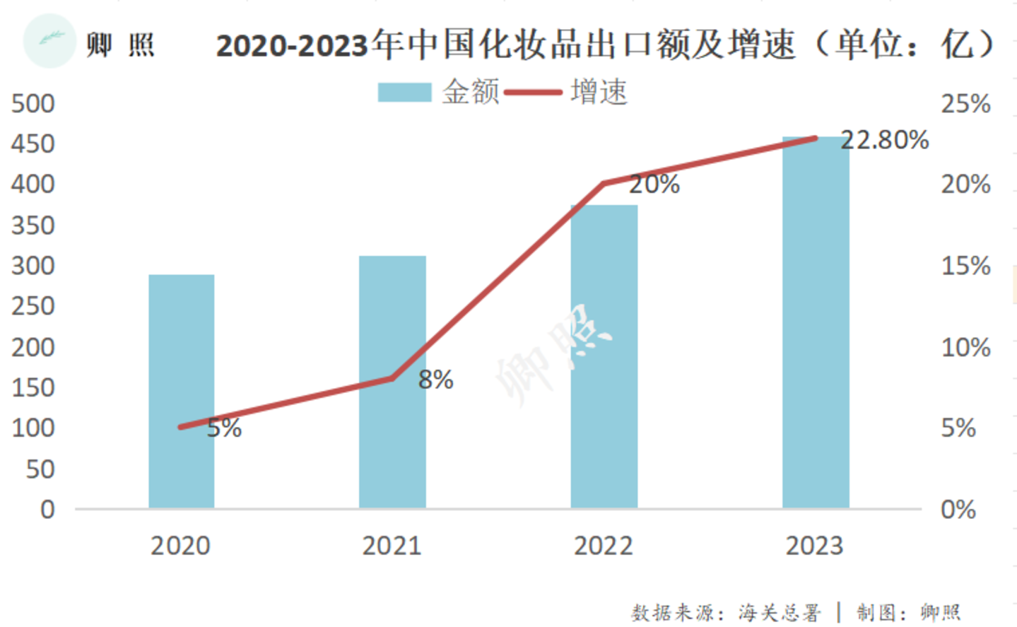 当然,这一现象早在去年就很显著了,据央视财经《经济信息联播》栏目当时的报道,仅仅2023年前8个月,中国化妆品对韩国的出口额同比上涨大约190%。且过去几年国产化妆品对外出口增速明显,直至2023年全年增速达到22.8%。