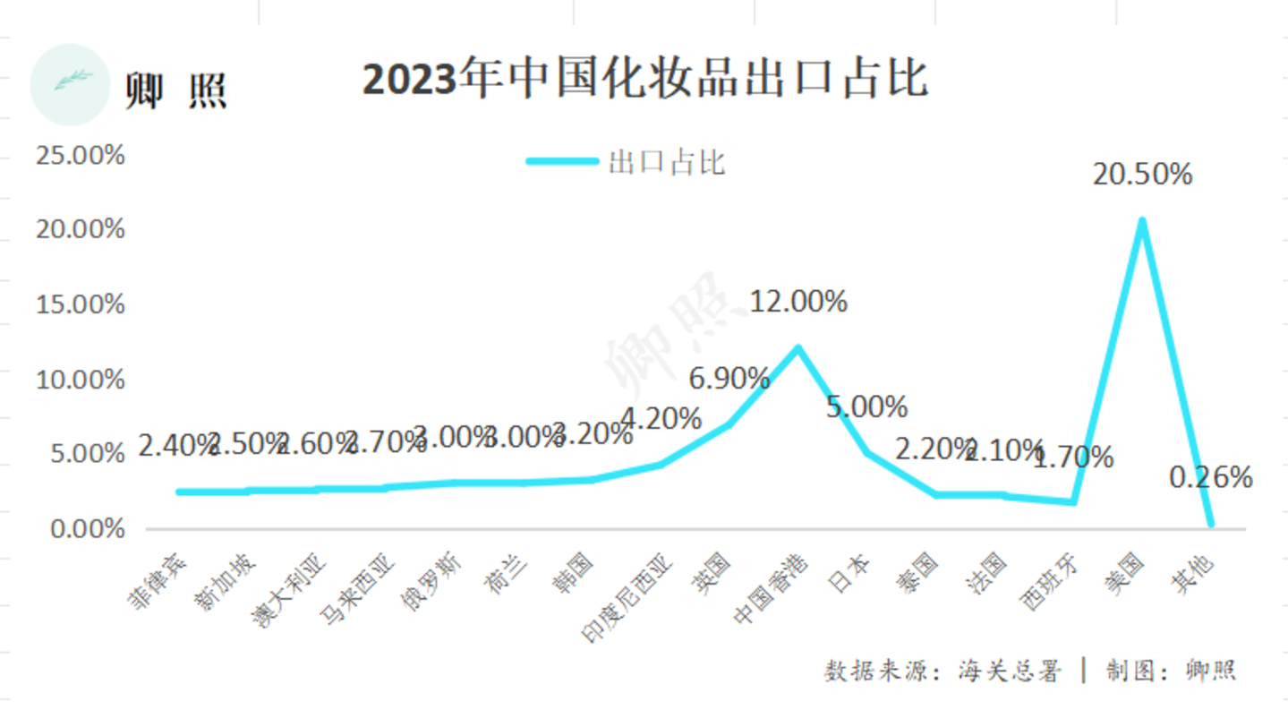 以韩国为例,一方面,韩国化妆品市场规模大,根据GlobalData曾经的预计,2026年韩国化妆品市场规模将增至28.278亿韩元(约合169亿元人民币),但在2023年我国对外化妆品的出口占比份额仅在3%左右,还有很大的增长空间。