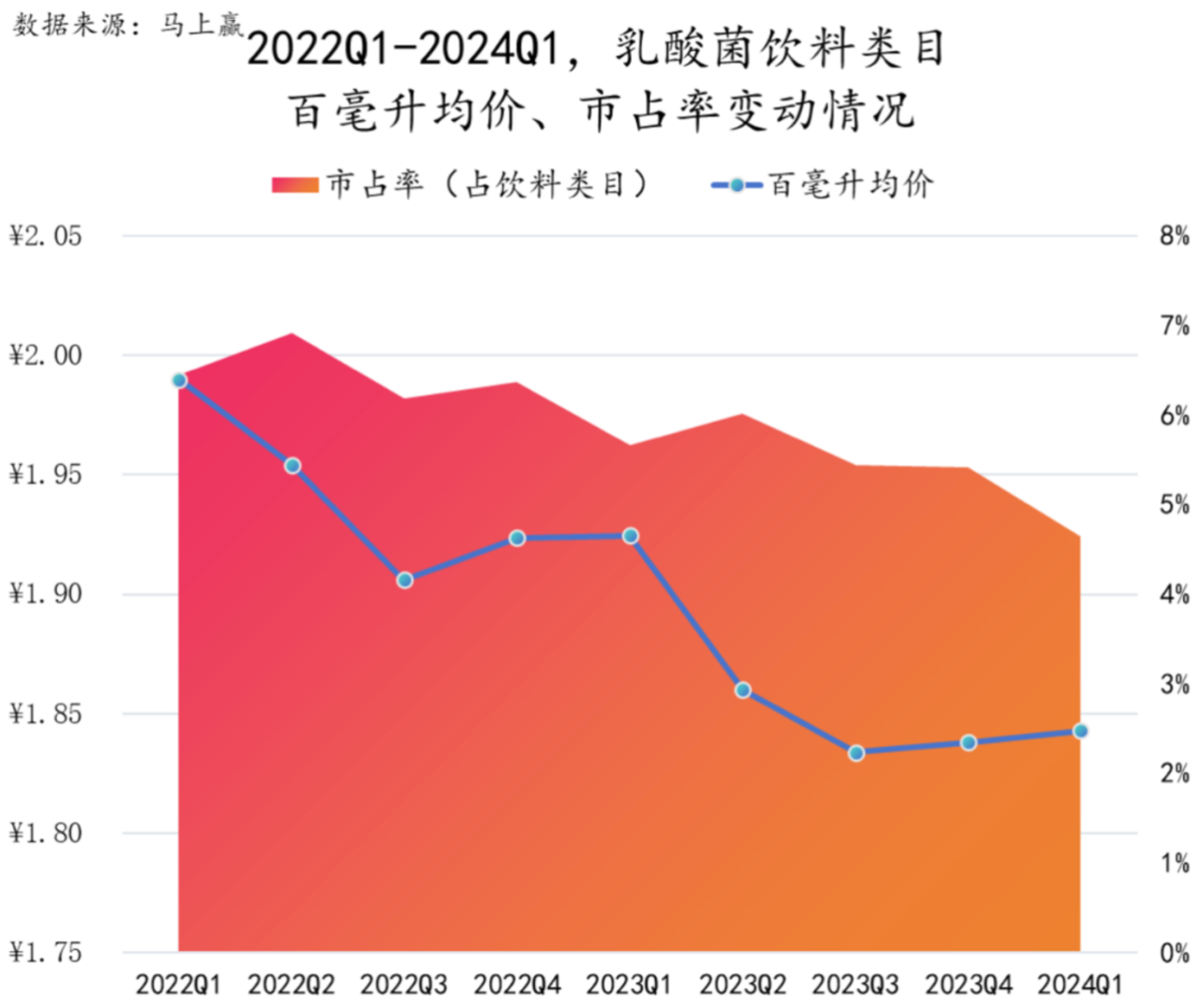 自2022年开始,乳酸菌饮料整体呈现出均价和市场份额双双下滑的趋势。数据显示,乳酸菌饮料占饮料类目的百分比在2022年第二季度达到最高峰,为6.91%;在今年第一季度则达到最低点,为4.65%,下降趋势明显。