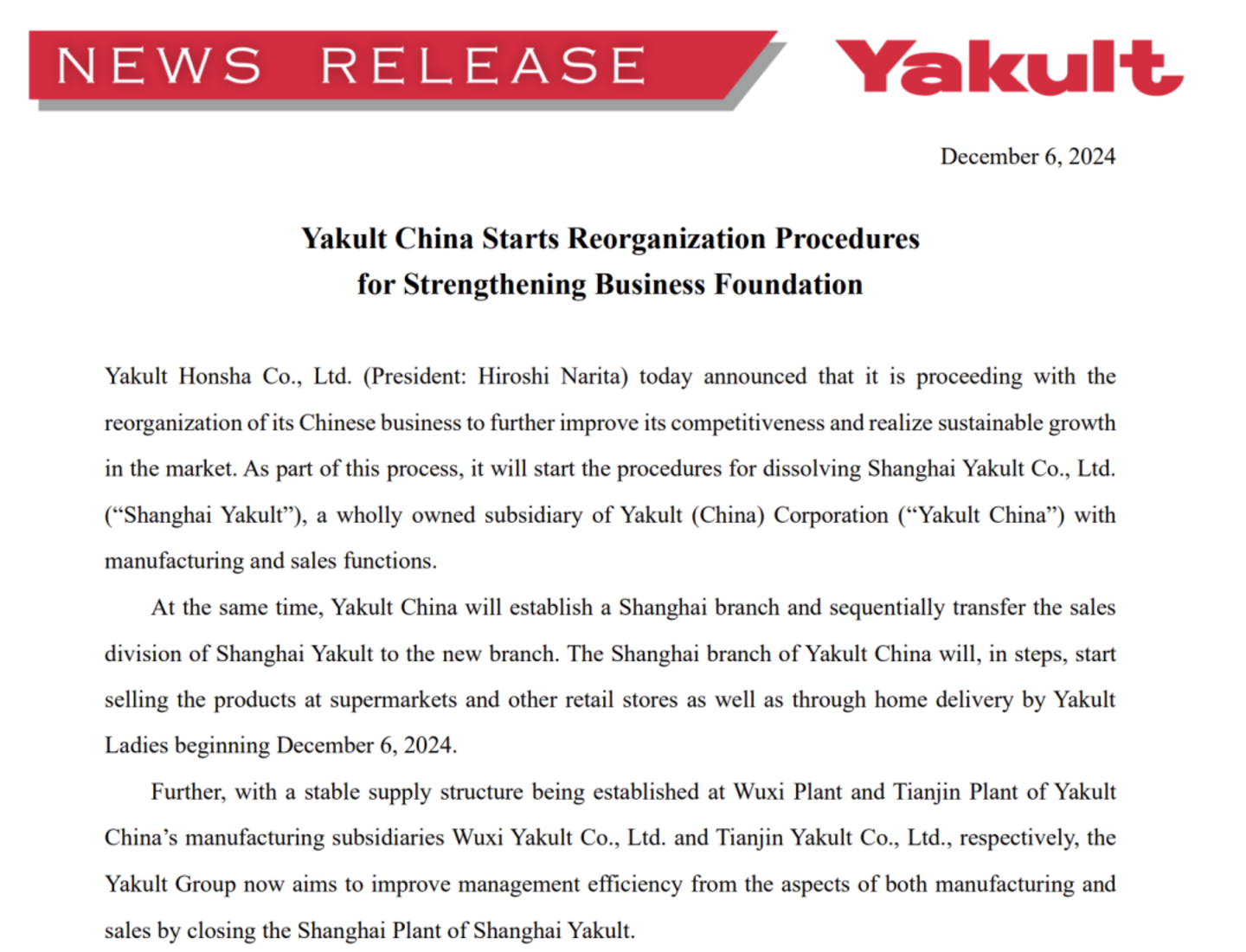 与此同时,养乐多本社还将解散当地法人“上海益力多乳品有限公司”,该公司的营业部门等业务将由养乐多本社的全资子公司“养乐多(中国)投资有限公司”接手。