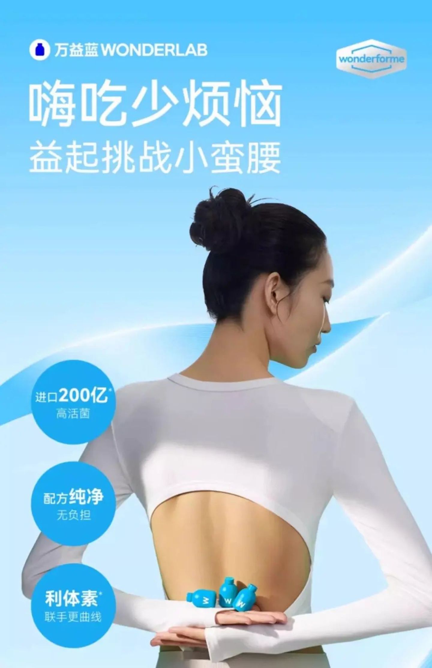 目前,万益蓝WonderLab的在售产品线主要包括益生菌、营养代餐奶昔、膳食纤维等多个系列。而万益蓝WonderLab则将其益生菌产品巧妙的与“大餐救星” “瘦子菌、小蛮腰”等功效关联,作为产品的一大卖点进行推广。