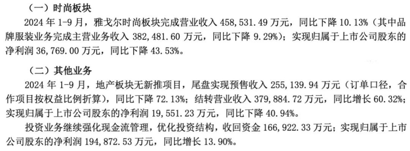 2024年前三季度,雅戈尔实现营业收入84.0亿元,同比增加12.6%;净利润25.1亿元,同比减少6.7%。