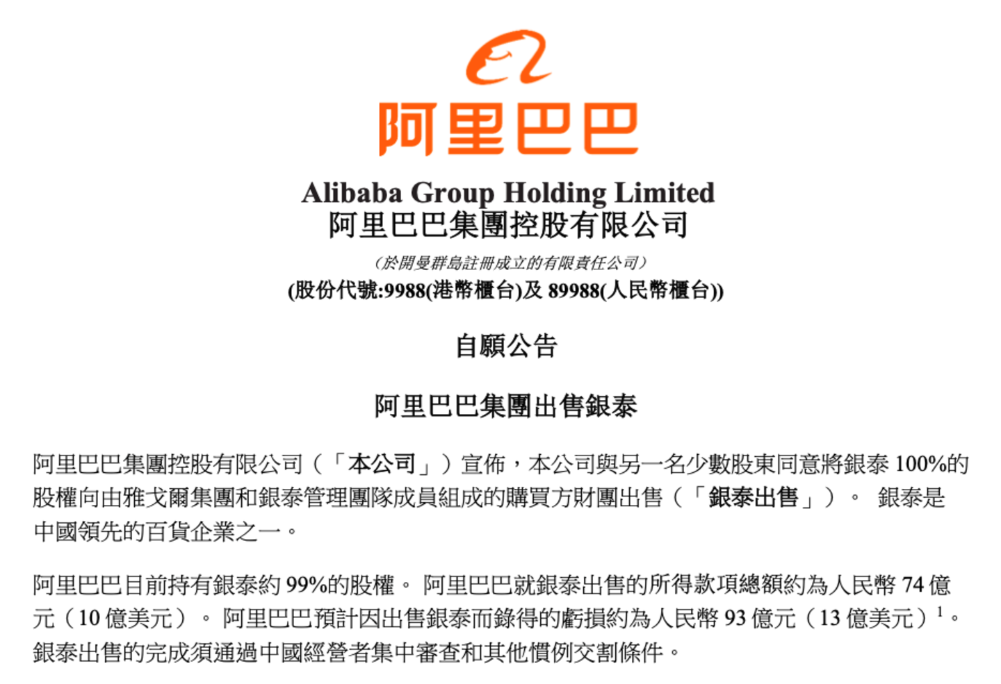 2024年12月17日,阿里巴巴发布公告,宣布将银泰100%的股权向由雅戈尔集团和银泰管理团队成员组成的购买方财团出售。阿里巴巴目前持有银泰约99%的股权,就银泰出售的所得款项总额约为74亿元。