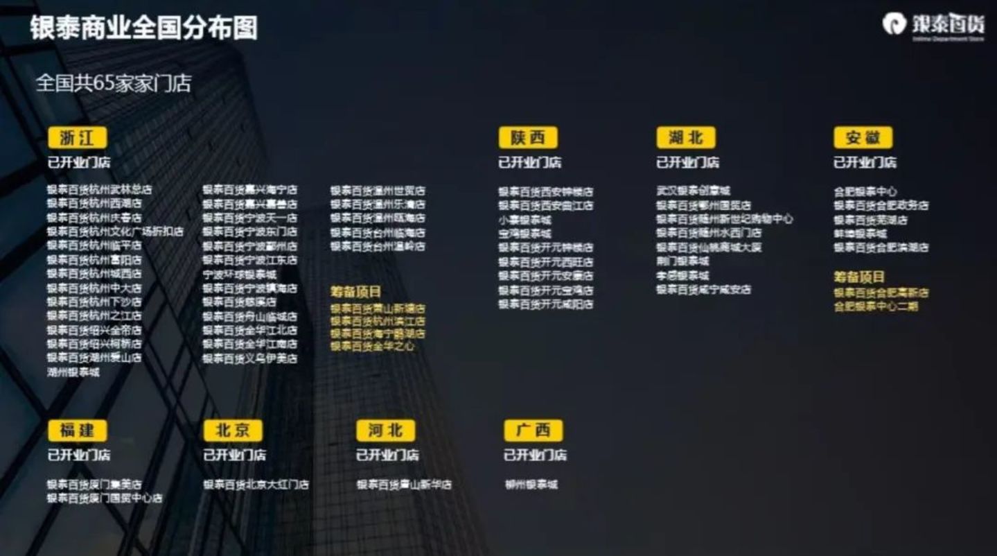 从1998年创立于杭州的银泰百货(武林店),到涵盖百货、购物中心等业态的综合商业集团,银泰见证了中国零售百货行业的多个时代。据银泰官方APP喵街数据,截至目前,银泰在全国有65家门店。