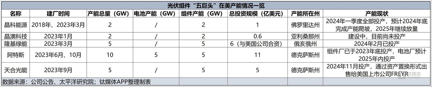 想突破出口上的层层贸易壁垒,除了依靠公司自身的积累、努力争取低关税外,最简单直接的办法就是将产能迁到海外关税较低地区。对于中国光伏来说,2015年面对欧美第二轮“双反”时,就已掀起过第一波出海建厂浪潮,那时的主要目的地是东南亚。而随着美国对东南亚“反规避”调查的启动,光伏中企也于2023年掀起了第二波产能出海潮,美国成了最主要的目的地之一。那一年,我国光伏组件“五巨头”,即晶科能源、隆基绿能、天合光能、晶澳科技和阿特斯相继赴美建厂,截至2024年12月,其中4家企业的工厂已经投产。晶科、阿特斯等都在今年半年报、三季报中提及过美国产能带来的可观盈利贡献。受此带动,2024年光伏产能出海的热潮仍在涌动,偏上游的龙头企业通威股份、协鑫科技都通过或并购或自己建厂的方式在中东、美国等区域进行布局,偏下游电池、组件则继续围绕东南亚、美国本土或近岸市场建设产能。