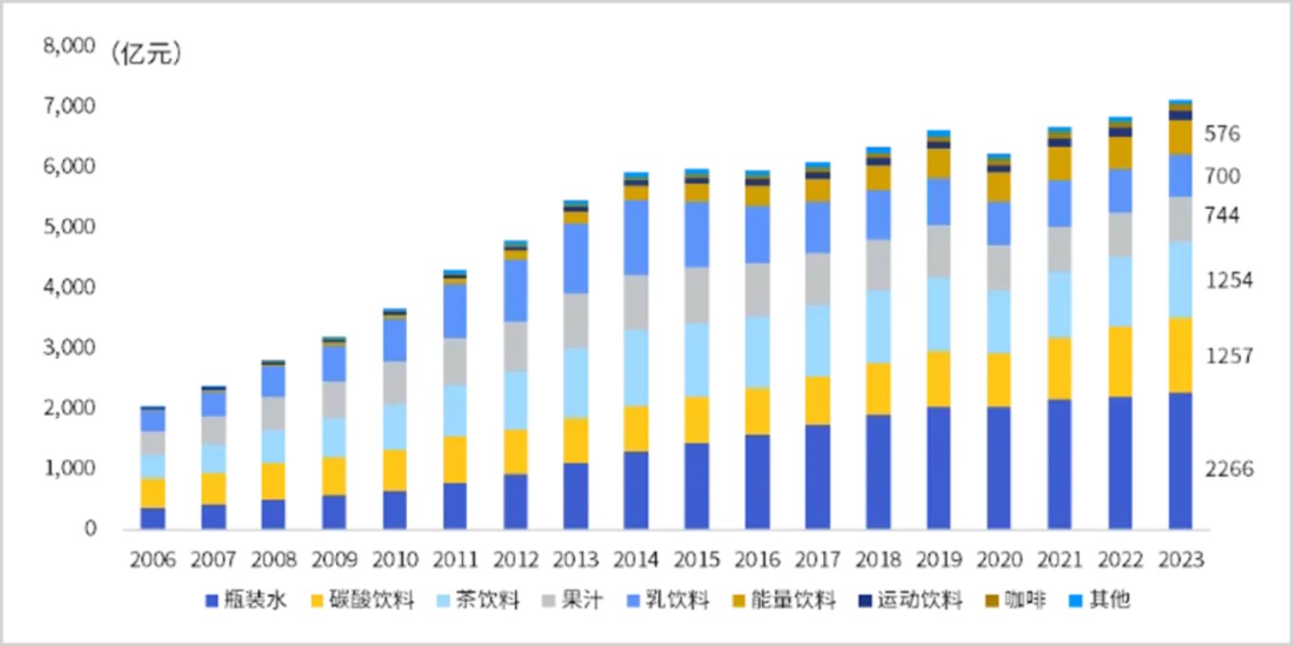 2023年,中国饮料行业市场规模超过7000亿元,属于水大鱼多的大赛道。拆分看,瓶装水、碳酸饮料、茶饮料、果汁、乳饮料、能量饮料市场规模靠前,占总市场规模的32%、18%、18%、10%、10%、8%。此外,运动饮料、咖啡饮料等占比就更小了。