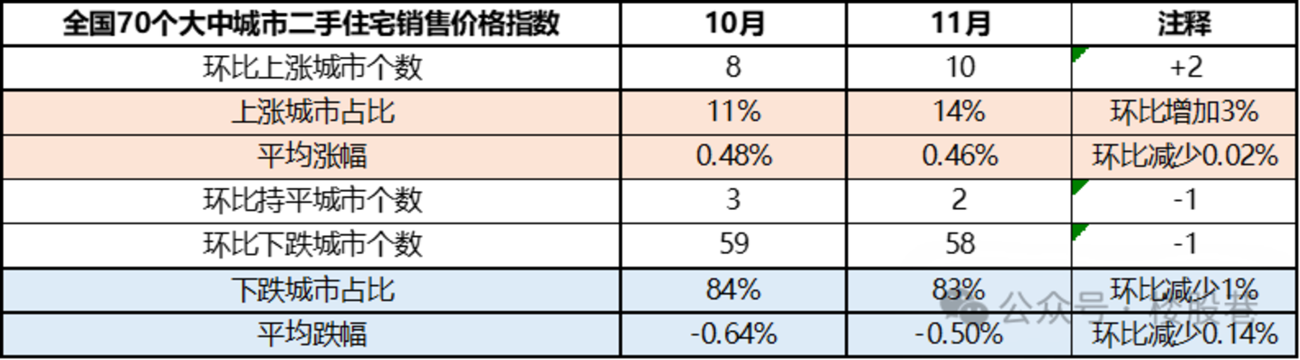 (2)涨跌幅幅度:11月上涨城市平均涨幅微降至0.46%;下跌城市平均跌幅缩窄至-0.5%。