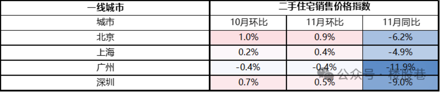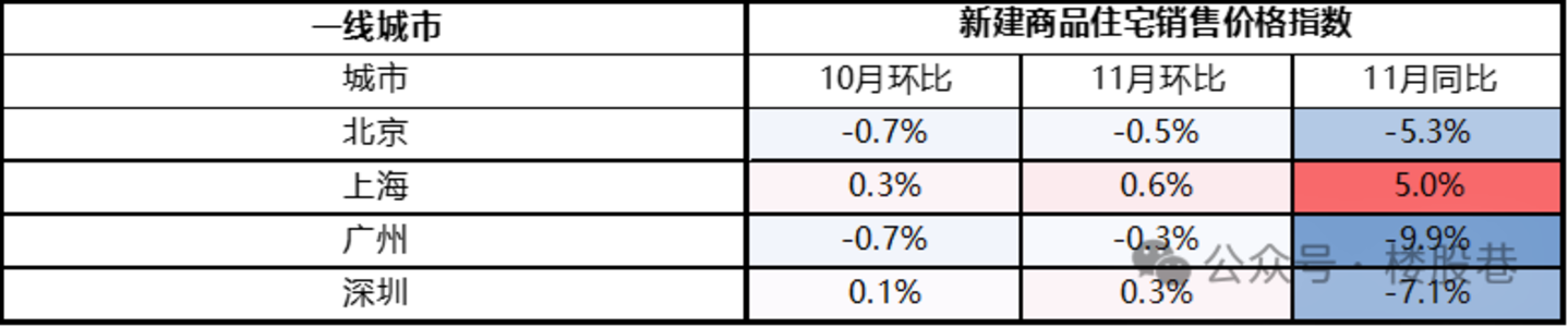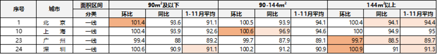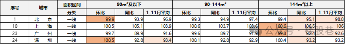 (3)一线城市:分化明显,其中上海表现强劲连续两个月环比分别上涨0.3%、0.6%,且11月同比大涨5%,主要受多个核心地段豪宅热销影响;深圳次之,同样环比两个月分别上涨0.1%、0.3%;北京表现较弱,主要由于新增供应为城市非核心项目、均价偏低;广州表现最弱,连续两个月环比下跌,且11月同比大幅下挫9.9%。
