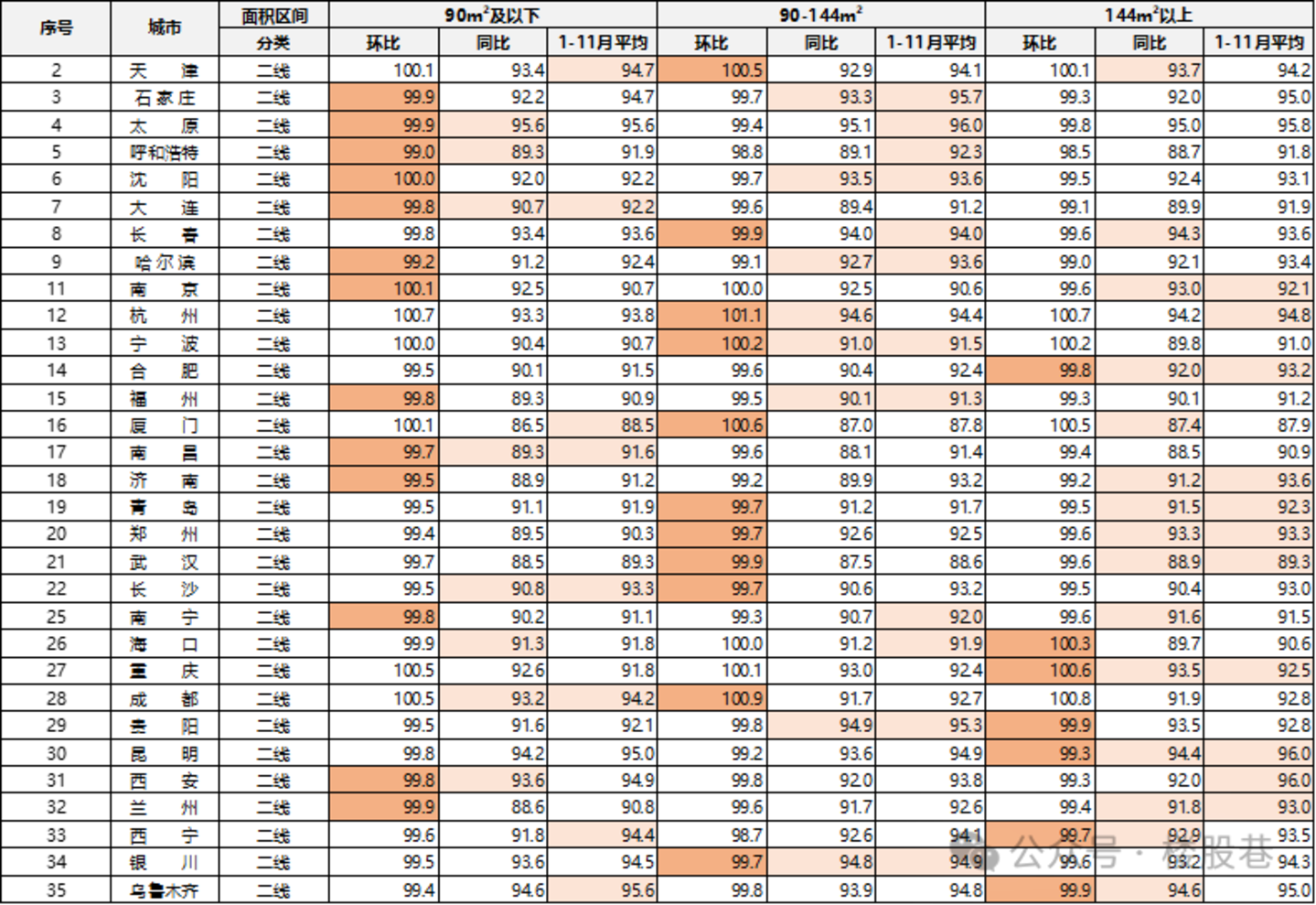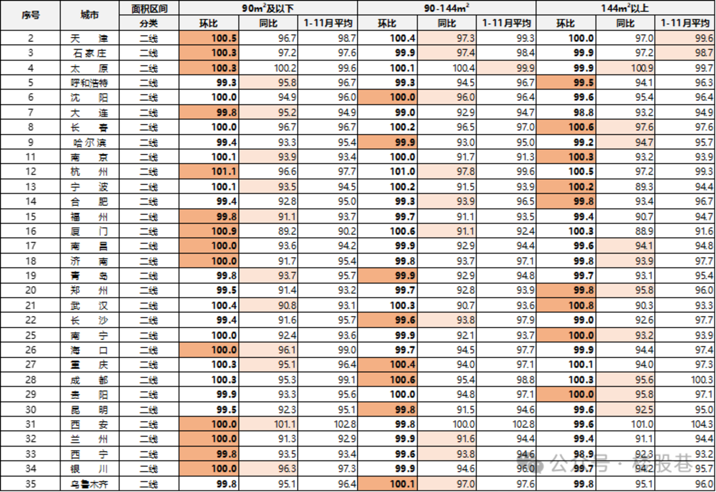 (1)涨跌幅数量:11月环比上涨城市10个,对比10月增加2个城市,上涨城市占比升至14%;持平城市2个;下跌城市减少1个至58个。