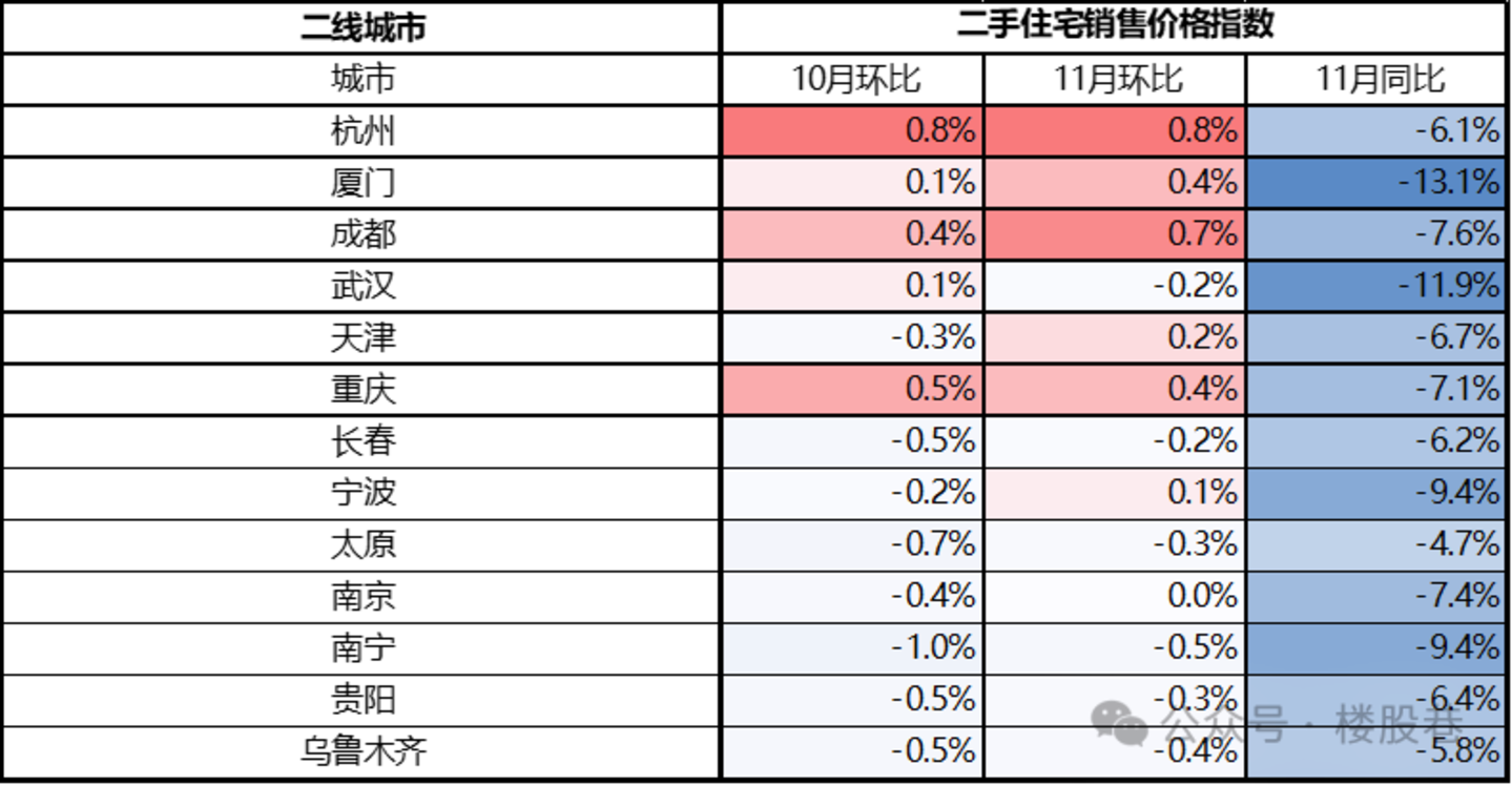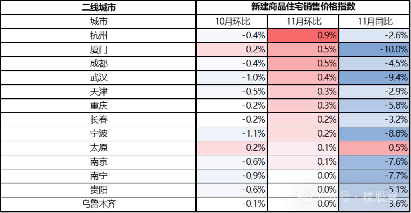 (4)二线城市:热点城市11月有明显回暖,环比涨幅居前的为杭州、厦门、成都、武汉、天津、重庆等,环比涨幅在0.3~0.9%;此外杭州、成都、天津、长春乌鲁木齐等城市11月环比跌幅均小于5%;太原是唯一一个连续两个月环比上涨且11月同比亦上涨的城市。