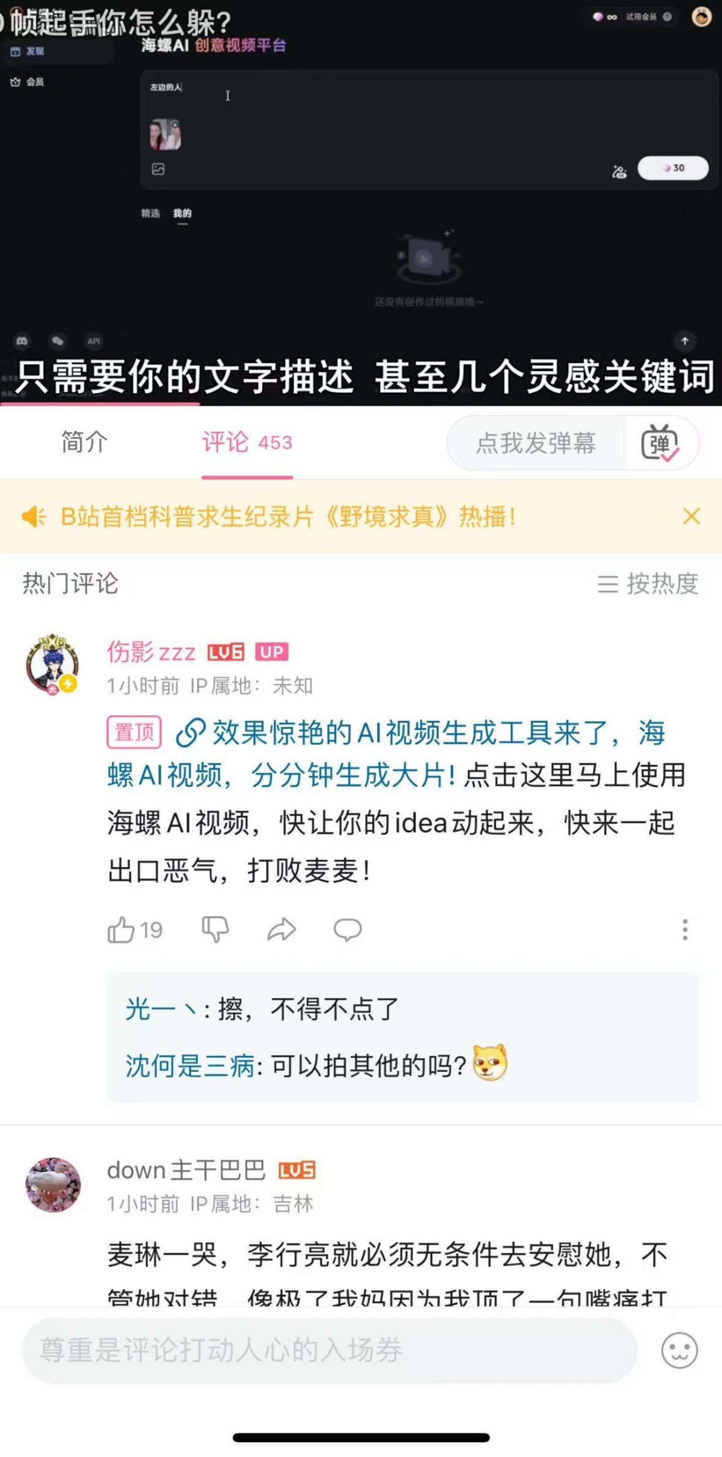 Minimax的思路其实有可行性,B站天然自带恶搞、鬼畜基因,这与当前AI视频模型呈现效果适配。较早一批“麦琳打架AI合成”和“麦琳打架恶搞”视频就是从B站流出来,从评论区来看,观众并没有产生不适感,反而觉得AI的形式更能表达自己看综艺时的情绪。
