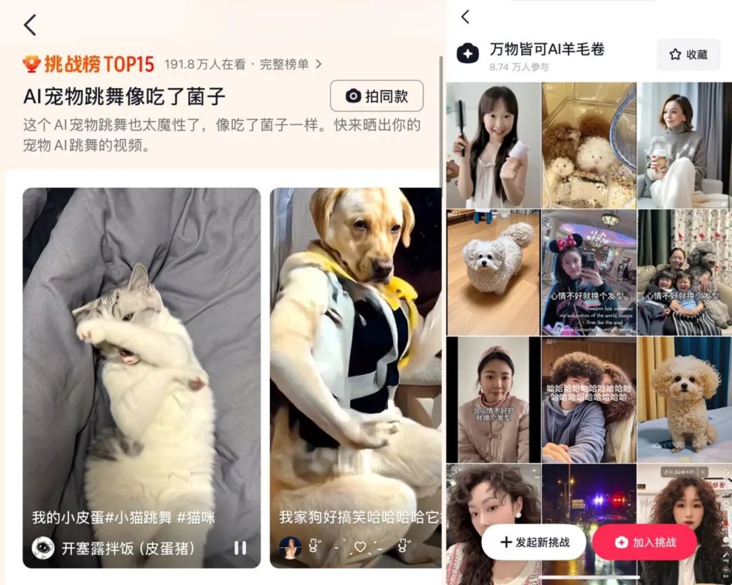 目前,AI在抖音落地找到了中间态——AI特效。诸如“AI宠物跳舞像吃了菌子”和“万物皆可AI羊毛卷”等素材模板热度高居不下。截至12月9日,“万物皆可羊毛卷”素材模板显示近300万人用过。