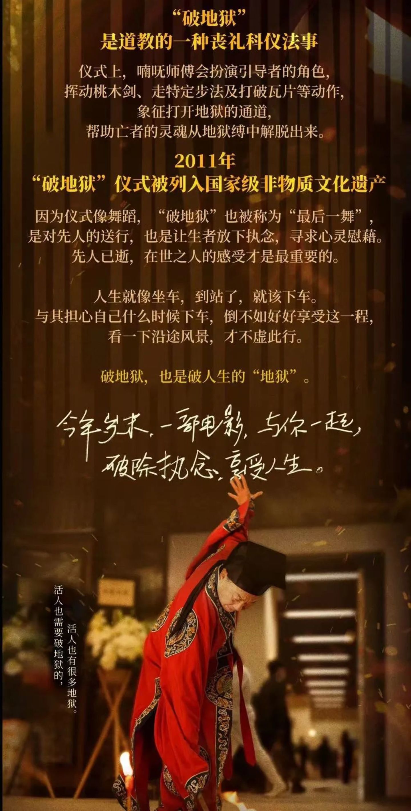 《破·地狱》则是香港首部殡葬题材影片,融入了本土文化特色。其英文名“last dance”,一语双关,作为香港主流丧礼仪式、非物质文化遗产,“破地狱”的仪式像一支舞——喃呒师傅旋转敲碎瓦片,喷酒吐火,大喝一声“跟我走!”带领超度亡魂,同时这也是人生的最后一舞。