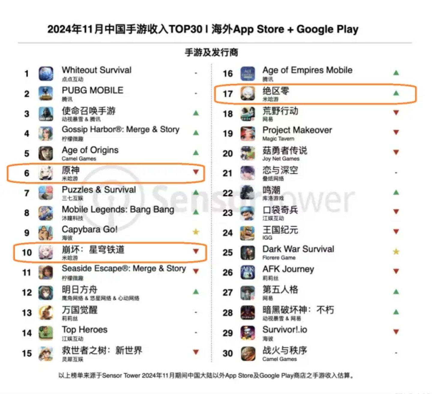 Sensor Tower的数据显示,2024年11月“中国手游收入TOP30|海外App Store+Google Play”,《绝区零》仅仅位列第十七位,落后于《原神》与《崩坏:星穹铁道》。