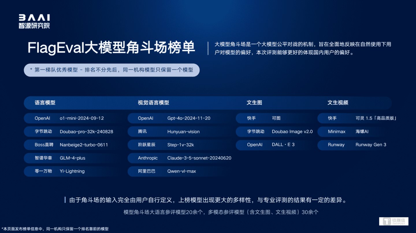 此外,FlagEval大模型角斗场,是智源研究院今年9月推出的面向用户开放的模型对战评测服务,共有29个语言模型、16个图文问答多模态模型、7个文生图模型、14个文生视频模型参评,最终OpenAI、快手、字节跳动、腾讯的大模型排名前列;模型辩论平台FlagEval Debate方面,Anthropic Claude-3-5-sonnet-20241022、零一万物Yi-Lighting、OpenAI o1-preview-2024-09-12为前三名;金融量化交易评测结果显示,深度求索 Deepseek-chat,OpenAI GPT-4o-2024-08-06,Google Gemini-1.5-pro-latest位列前三。