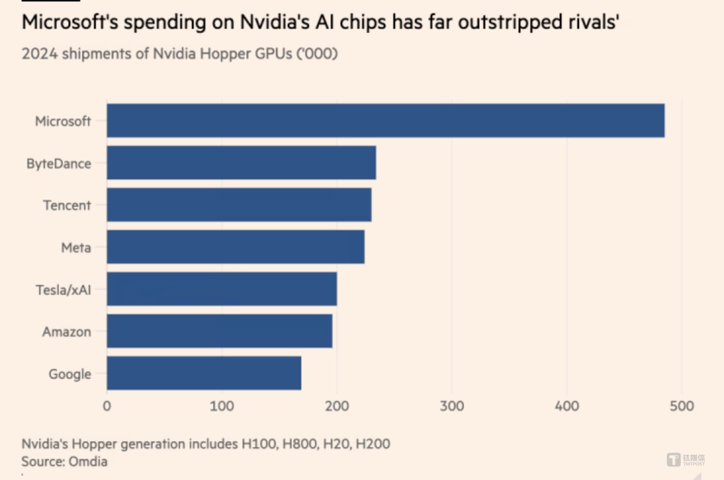具体来说,研究机构Omdia报告显示,微软今年采购了约48.5万片英伟达Hopper 架构的H100/H200 GPU计算卡,是其2023年购买的同代英伟达 AI 处理器数量的三倍多,并列排名第二是两家中国公司——字节跳动、腾讯,都分别采购约23万片英伟达GPU芯片,超越Meta、亚马逊和谷歌等美国科技巨头。