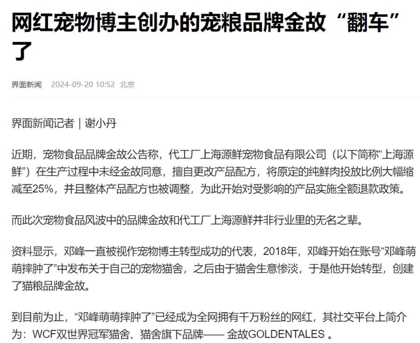今年9月,宠粮品牌“金故”创始人邓峰在社媒发布视频,声称与金故合作的代工厂“源鲜”私自更改了产品配方,将原定的纯鲜肉投放比例大幅缩减至25%。据“趣解商业”了解,“源鲜”曾是网易严选、喵梵思等国产中高端品牌多次合作的代工厂,在不少养宠人心中有较高信任度;“源鲜”的塌房,再次挑动了许多养宠人的神经。