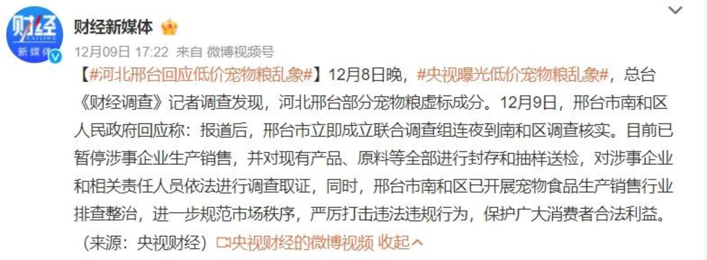 目前,邢台市南和区已开展宠物食品生产销售行业排查整治,进一步规范市场秩序,严厉打击违法违规行为,保护广大消费者合法利益。