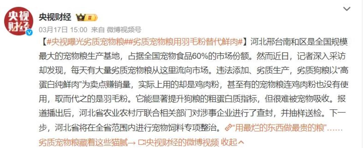 事实上,这已经不是河北宠粮第一次“塌房”了,今年“3·15”期间,央视就曾曝光河北邢台有厂家用劣质原料生产宠物食品。