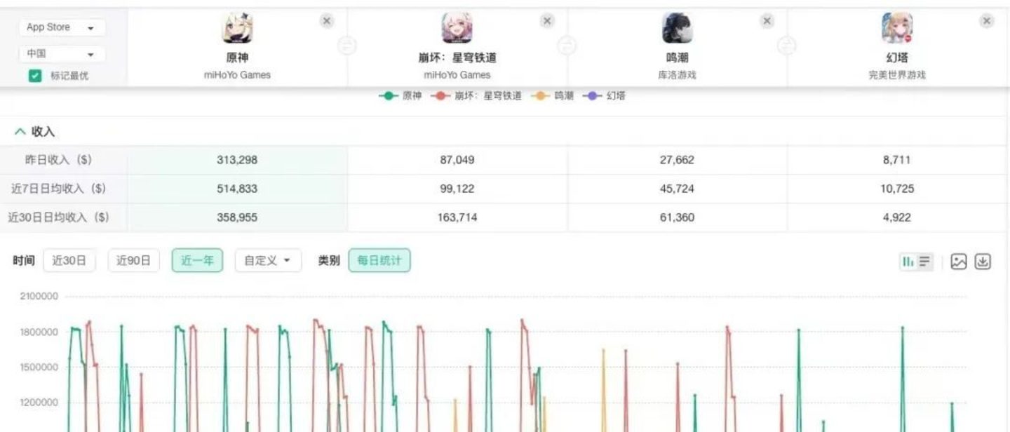 而自《原神》在开放世界领域杀出一条新路径后,系列开放世界游戏相继诞生,包括自家的《崩坏:星穹铁道》,《幻塔》《鸣潮》《无限暖暖》等等,明年更是将迎来三端互通开放世界产品的“大年”。娱乐独角兽注意到,现今几款二次元开放世界手游格局稳定。七麦数据显示:《原神》《崩坏:星穹铁道》仍然是当中最“能打”的产品,近30日日均收入分别为35.89万美元、16.37万美元,《鸣潮》的近30日日均收入为6.13万美元,《幻塔》为0.49万美元。