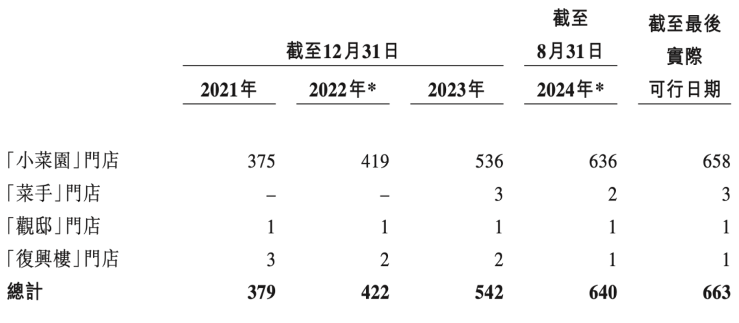 品牌化方面,除“小菜园”外,还打造了“观邸”“复兴楼”“菜手”等品牌,但小菜园663家门店中,“小菜园”品牌门店数达到658家。“复兴楼”的门店数量最高时也仅有3家,如今仅存1家,其他门店先后被改造为“小菜园”;“观邸”同样只有1家门店。