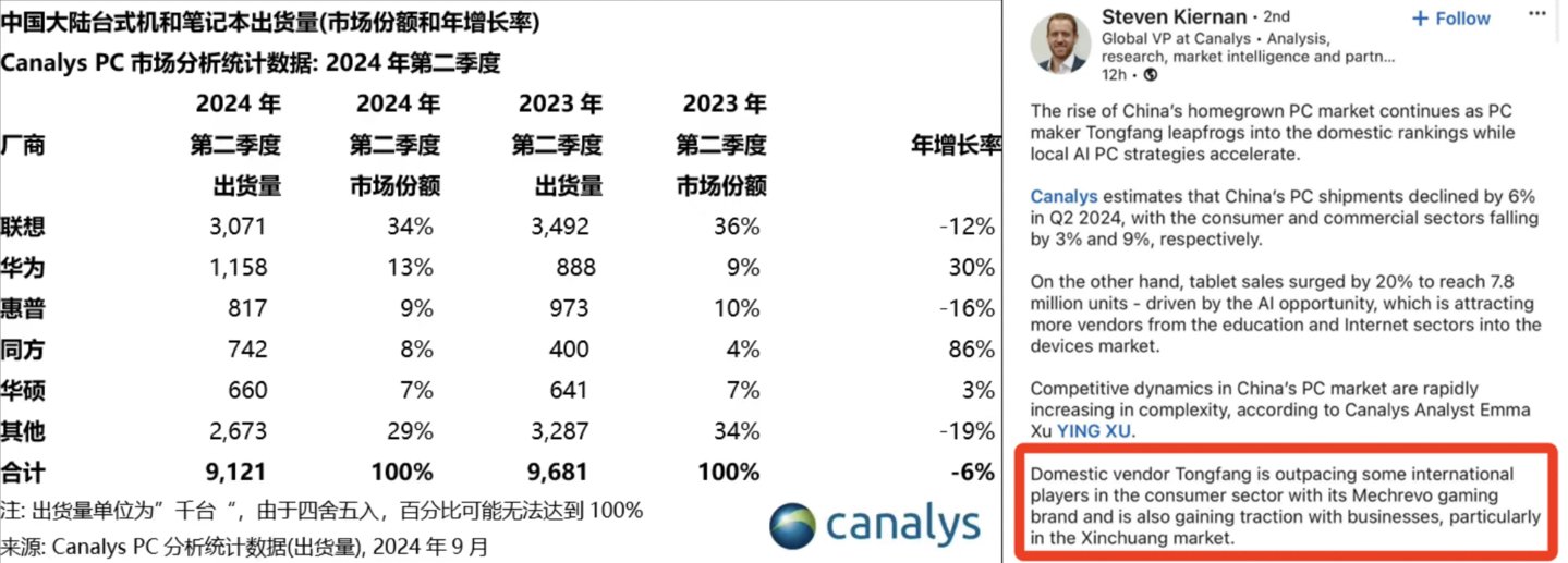 在Canalys的数据追踪中,中国市场二季度的PC销量排行中,除了华为,还有一家PC厂商实现了销量的大幅增长,成为二季度国内PC市场的“最大黑马”。