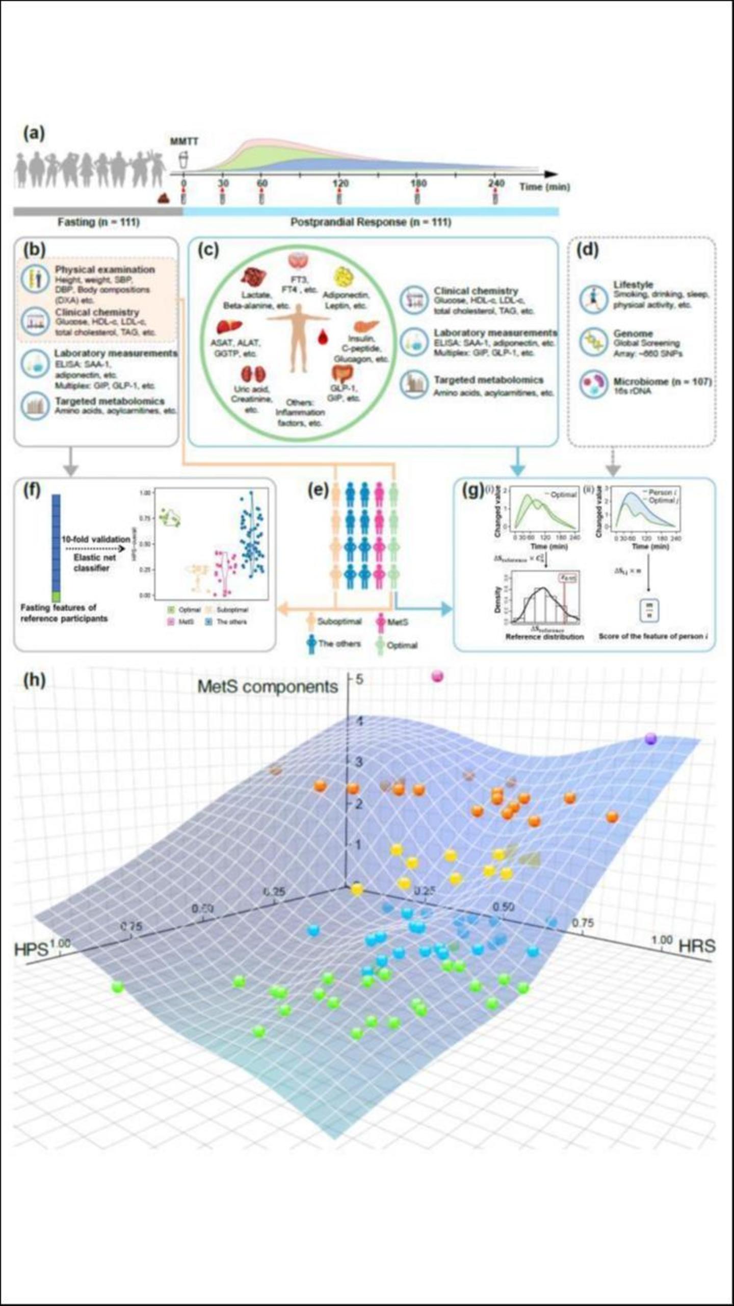 研究团队招募了111名年龄跨度从20岁至70岁的健康、肥胖和代谢高危个体,通过营养“压力实验”,即给予研究参与者含有糖、脂、蛋白质三大宏量营养素的标准混合食物,从而观察其在空腹状态下的代谢状况和餐后的“稳态弹性”,以及对糖、脂、蛋白质的应答反应。
