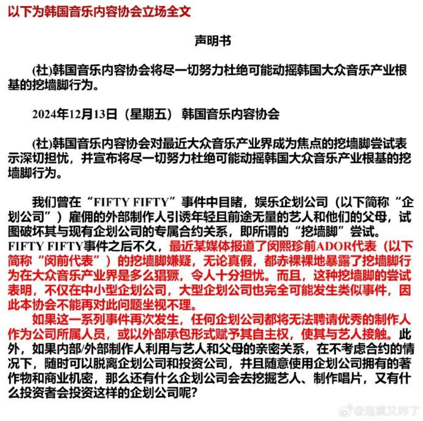 特别是韩国音乐内容协会,还点名指出闵熙珍的“挖墙脚”的嫌疑,要求闵熙珍针对“挖墙脚”行为及合同纠纷指控作出明确回应。协会强调,闵熙珍应避免模棱两可的言辞,正面澄清事实,以彻底解决争议。