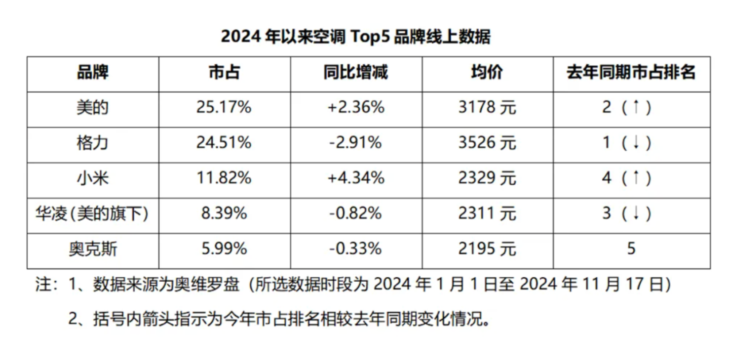 奥维罗盘2024年空调线上市占数据显示,小米的市占率与去年同期相比提升了4.34个百分点,超越华凌进入前三。而小米的增长则挤压了格力的市占份额,这也是让董明珠感到压力的原因。