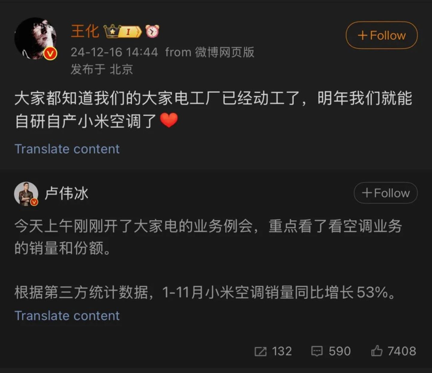 小米集团合伙人、总裁卢伟冰则发微博称,根据第三方统计数据,1-11 月小米空调销量同比增长 53%。