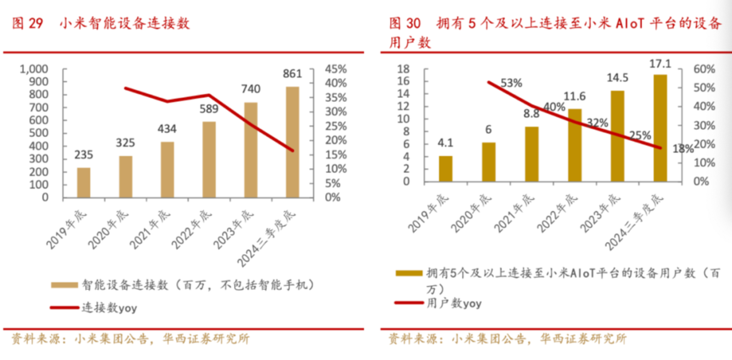 而米粉文化转为对智能生态的粘性,并进一步提高品牌复购率的影响也不容忽视。根据小米2024年10月发布会,小米最新的软件系统在设备互联方面持续提升用户体验。根据小米公告,截止2024年三季度底,小米智能设备连接数超过8亿个,其中拥有5个以上连接设备的用户数约1700万。