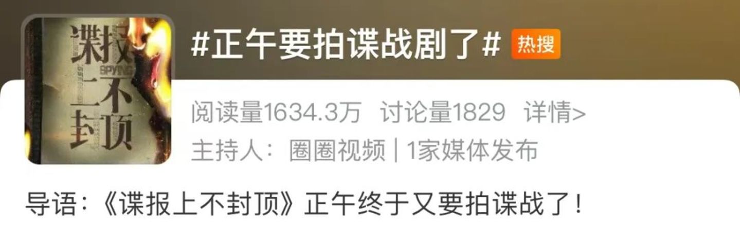 近期,正午阳光继《伪装者》之后再次拍摄谍战剧的消息登上微博热搜,而正午操盘的谍战IP为豆瓣阅读的《谍报上不封顶》,曾经打造过同类型全民爆款《伪装者》的头部影视公司入局,让这一豆瓣阅读IP在开拍前收获了极高的关注度。