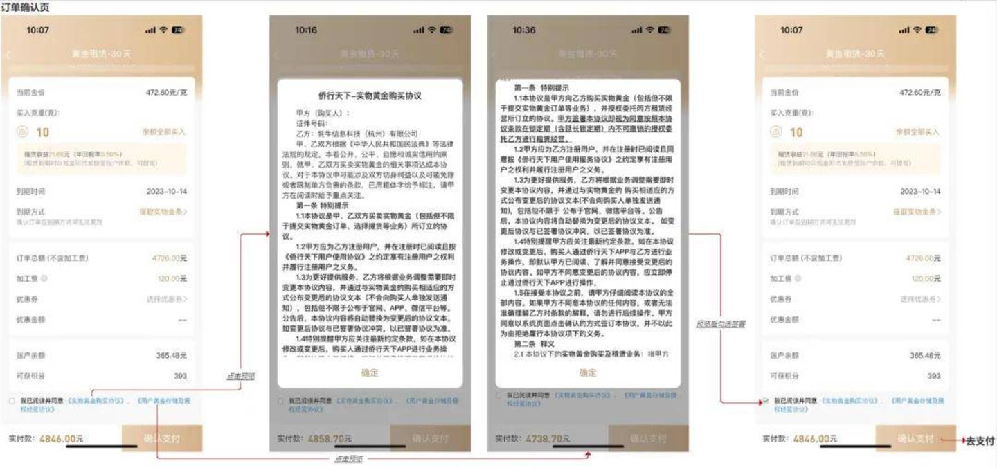 根据投资者的介绍,侨行天下的该项投资操作步骤非常简单。登陆侨行天下APP,在黄金理财中选中相应的产品、对应克数、到期方式、勾选《实物黄金购买协议》《用户黄金存储及授权经营协议》,提交订单,付款。黄金10克起买,投资金额仅需几千元,兑付期限分30天、90天、180天不等。