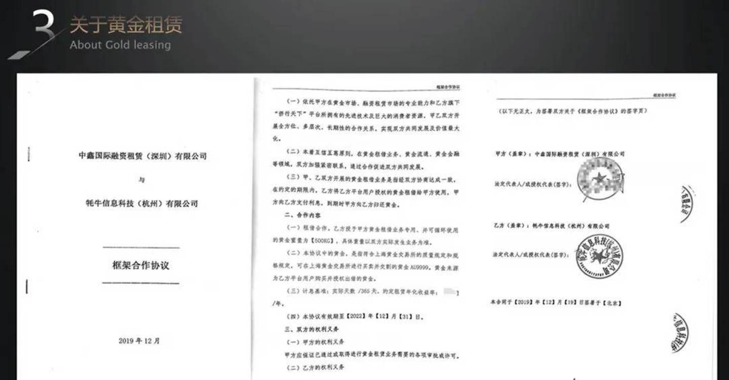 侨行天下APP提供的合同由投资者(甲方)、牦牛科技(乙方)、中鑫国际(丙方)三方共同签订。甲方向乙方购买实物黄金,并授权委托丙方租赁经营。丙方给甲方支付黄金出租收益,从而形成交易闭环。