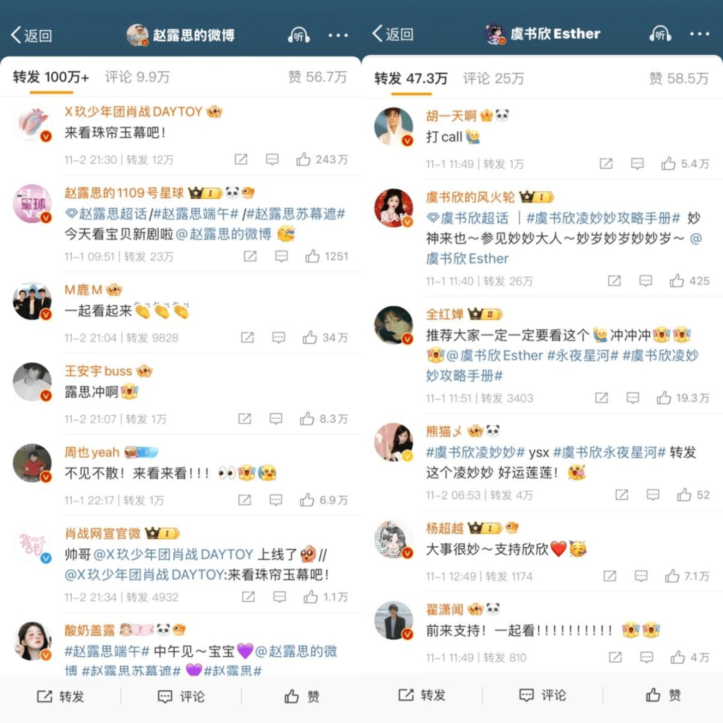 又如11月份同日开播的两部古偶《珠帘玉幕》《永夜星河》让“摇人式”剧宣再次火了起来,两位女主赵露思和虞书欣在剧集临播出前分别摇来一大波名人好友前来助力,既有肖战、鹿晗、王安宇、鞠婧祎等圈内人气明星,也有全红婵、匪我思存等圈外红人,成功拉高两部作品播前热度。