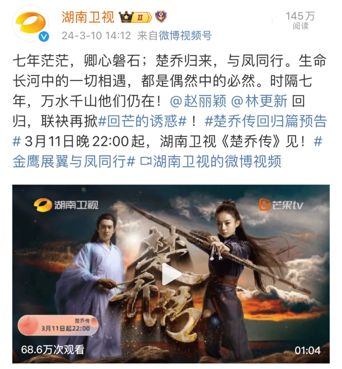 那厢芒果将独有的双平台优势发挥得淋漓尽致,一边在湖南卫视发布不同版本的“芒果味儿”预告,一边在芒果TV限时免费放送赵丽颖参与或主演的多档芒系综艺及主演的影视剧,还以更强的会员折扣力度推出“早凤票”,临播出之际甚至开启独家团建“迎凤礼”与鹅家分庭抗礼等。