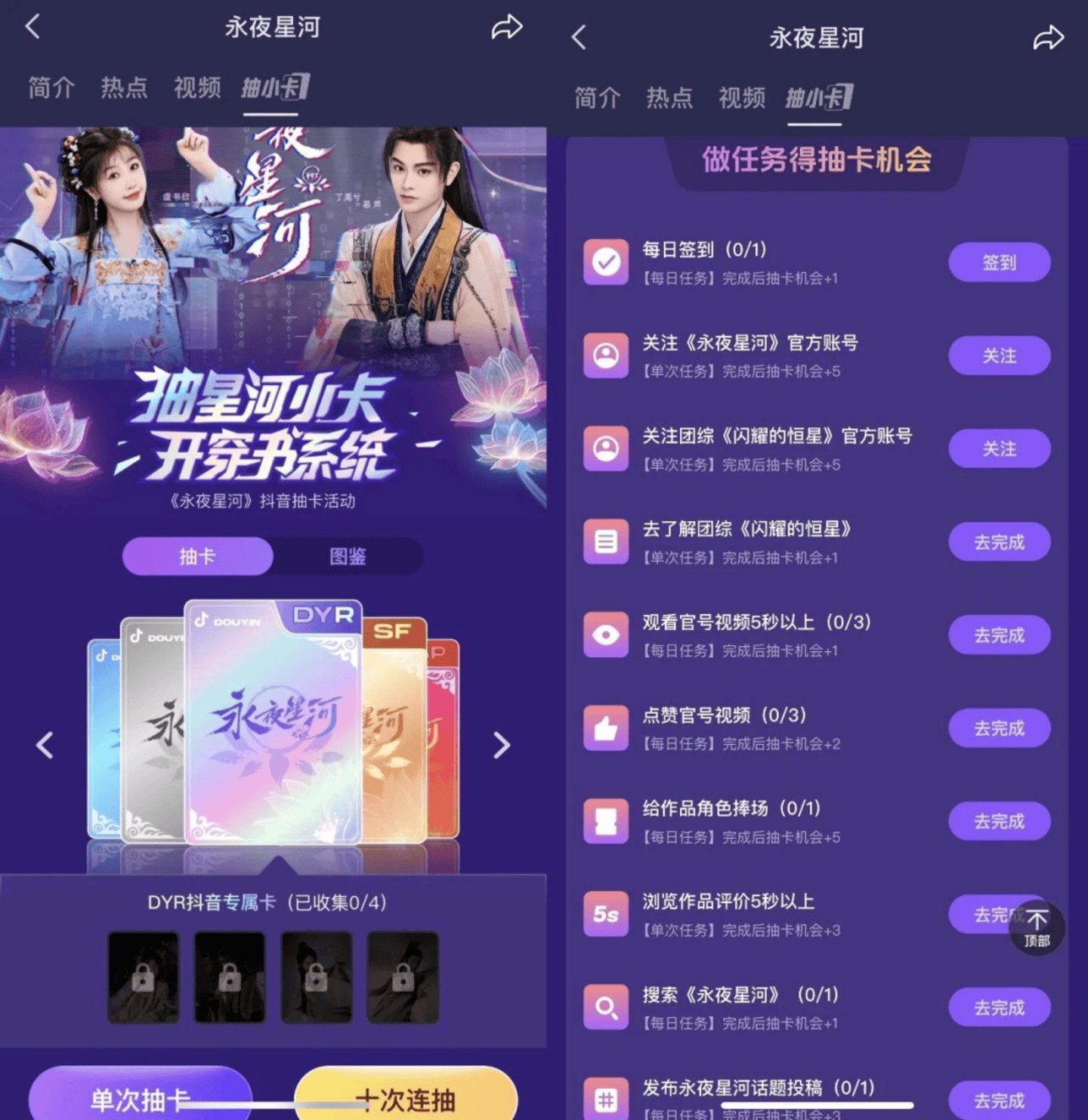 除了热搜话题、二创短视频、线下追剧团活动等常规操作,该剧最值得关注的是其在抖音端上新了抽卡玩法,并借助抖音生态将引流效果发挥到最大,甚至到剧集完结后还能看到很多用户仍在为了集卡做任务,有利于作品的热度留存。