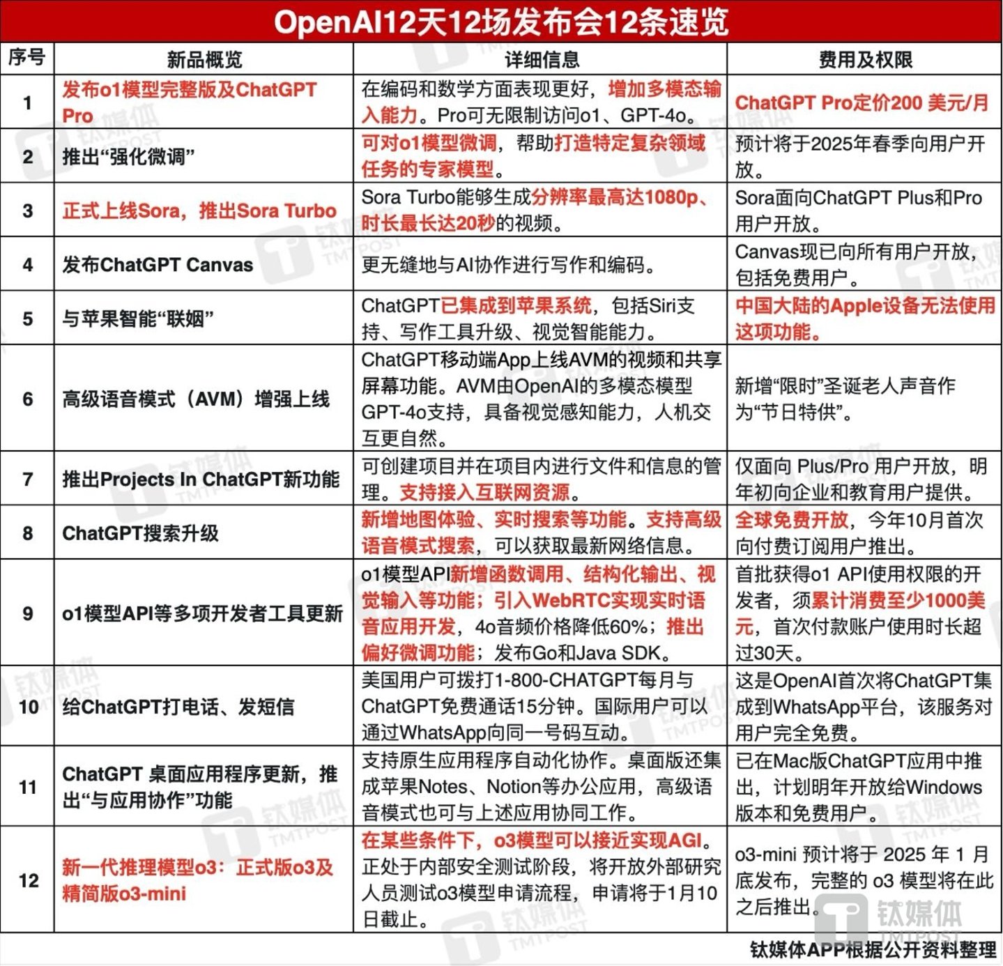 自当地时间12月4日到12月20日,OpenAI连续12个工作日召开12场直播发布会,面向普通用户、开发者、创作者等不同群体,推出完整版o1模型、上线Sora正式版以及推出新一代推理模型o3。此外,宣布已将ChatGPT集成进苹果系统,新增给ChatGPT打电话、ChatGPT应用协作等功能,并对原有高级语音模式、ChatGPT搜索等进行升级。下图为12天发布会内容速览:
