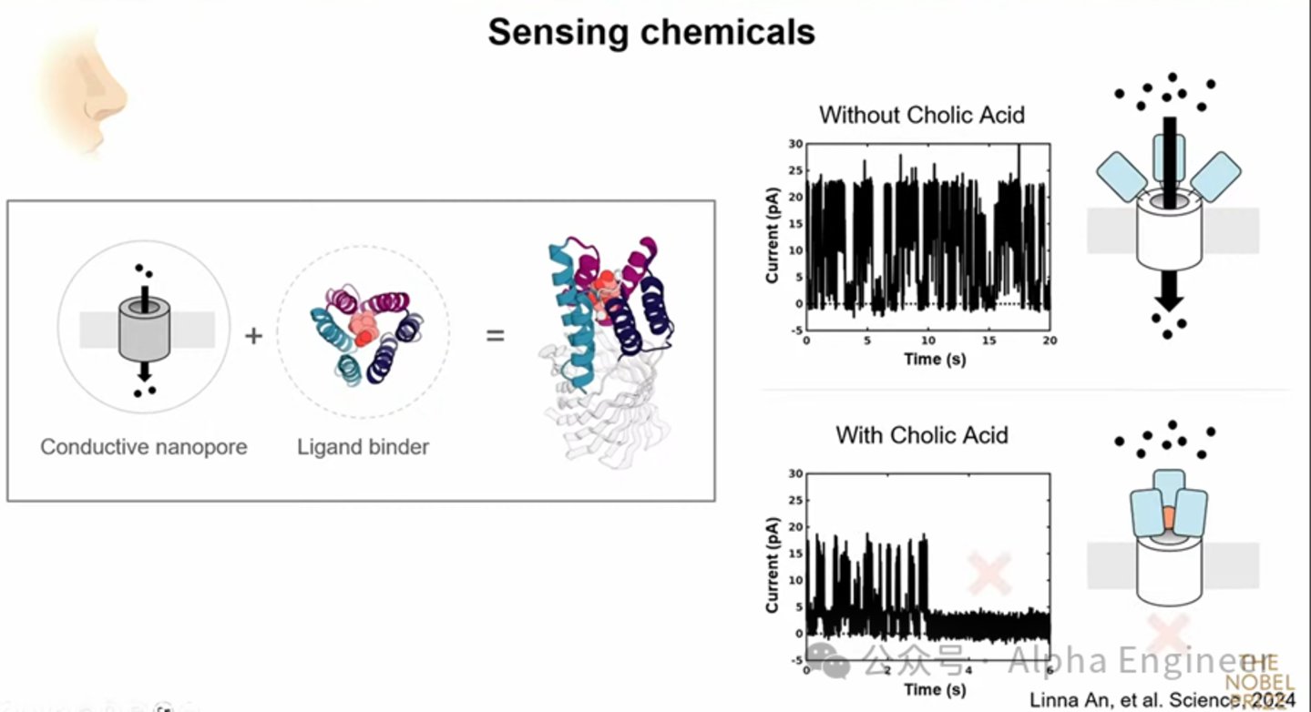 但它接触到目标分子时,通道会直接关闭,检测到电流完全中断。由于我们能够非常敏锐的测量电流信号,有了这种全新的蛋白质之后,我们可以生产出分子鼻子,识别任意分子,直接告诉你空气或者溶液中包含哪些分子。