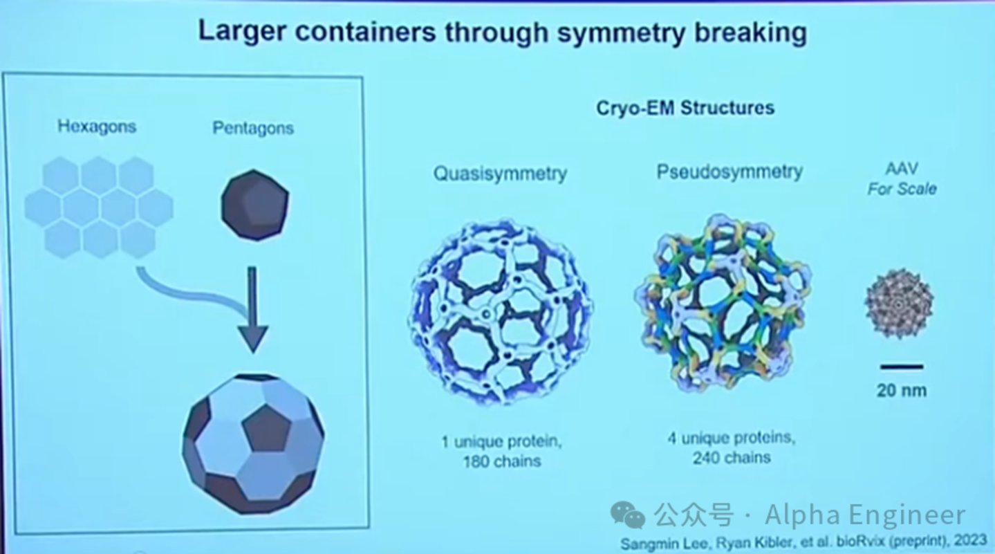 由于五边形和六边形内部夹角不同,因此需要特殊蛋白参与合成。下图右侧是电镜下的实验数据,通过这种方式合成的纳米粒子体积相比完全对称性的粒子要大得多。