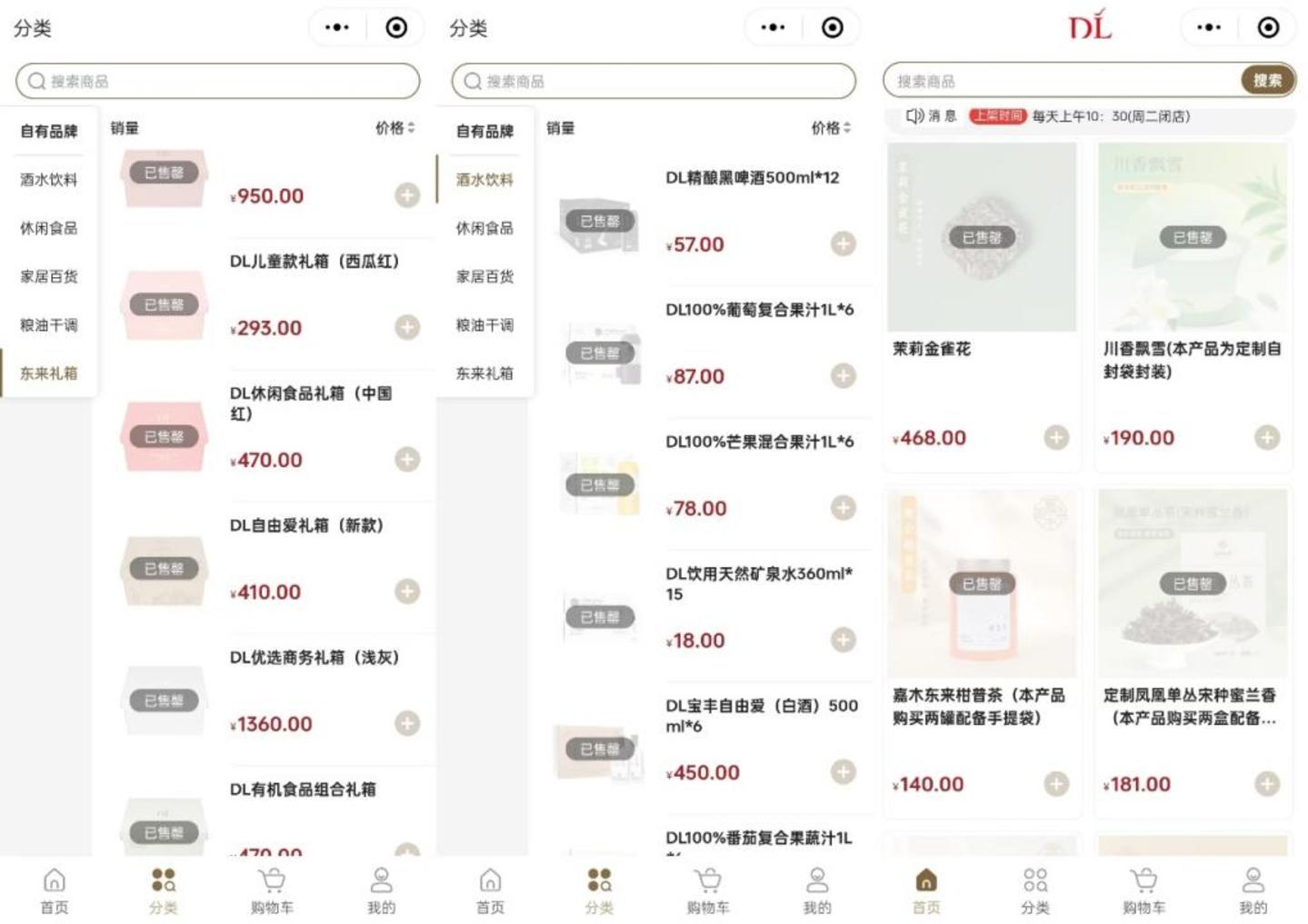22日上午,数科社分别搜索了东来优选超市和东来优选茶叶两个只售卖自营商品的官方小程序,发现自有品牌分类下的所有商品均显示已售罄,价格范畴从6元一袋的塑杯到最高1360元的DL优选商务礼箱。